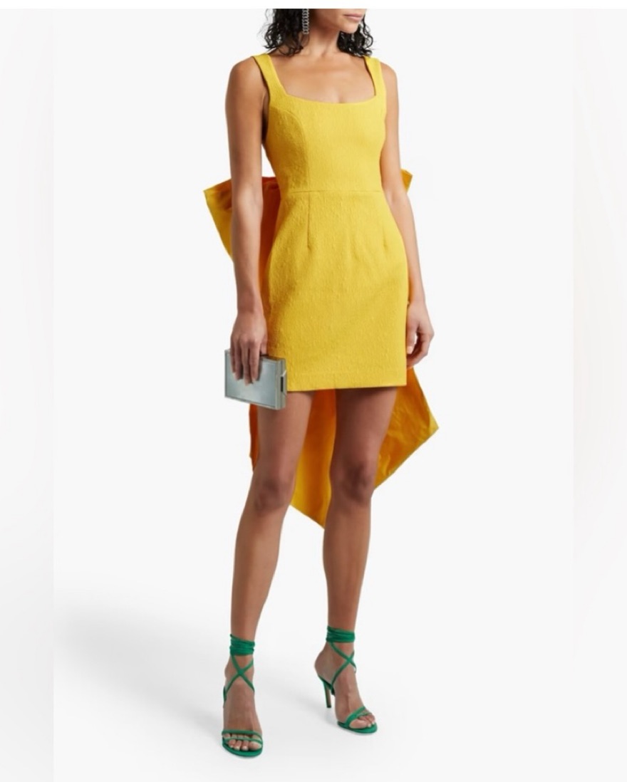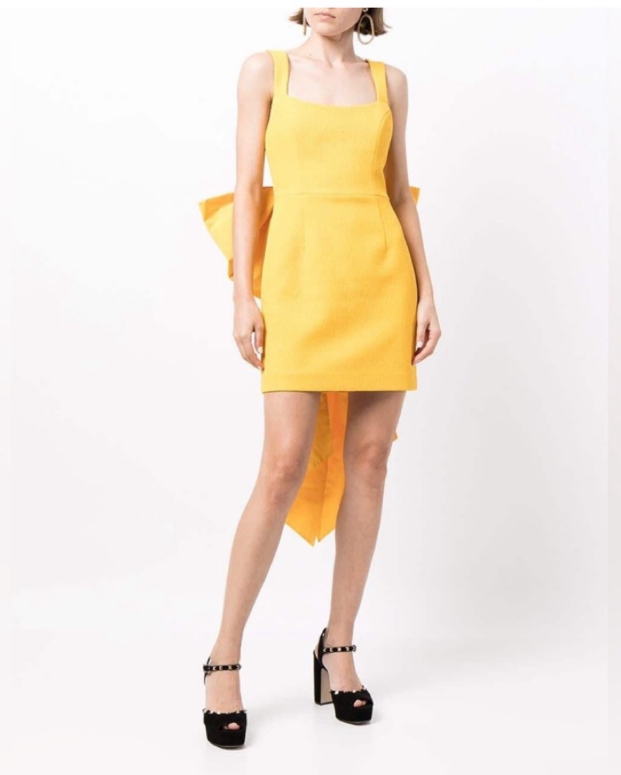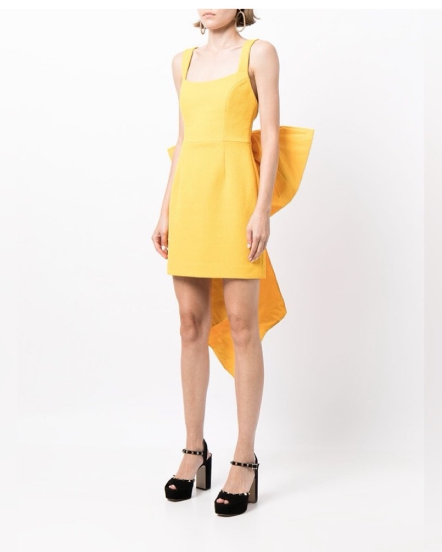 This bold and bright yellow mini dress features an oversized bow at the back that adds a modern touch. Perfect for a night out or a special occasion.
