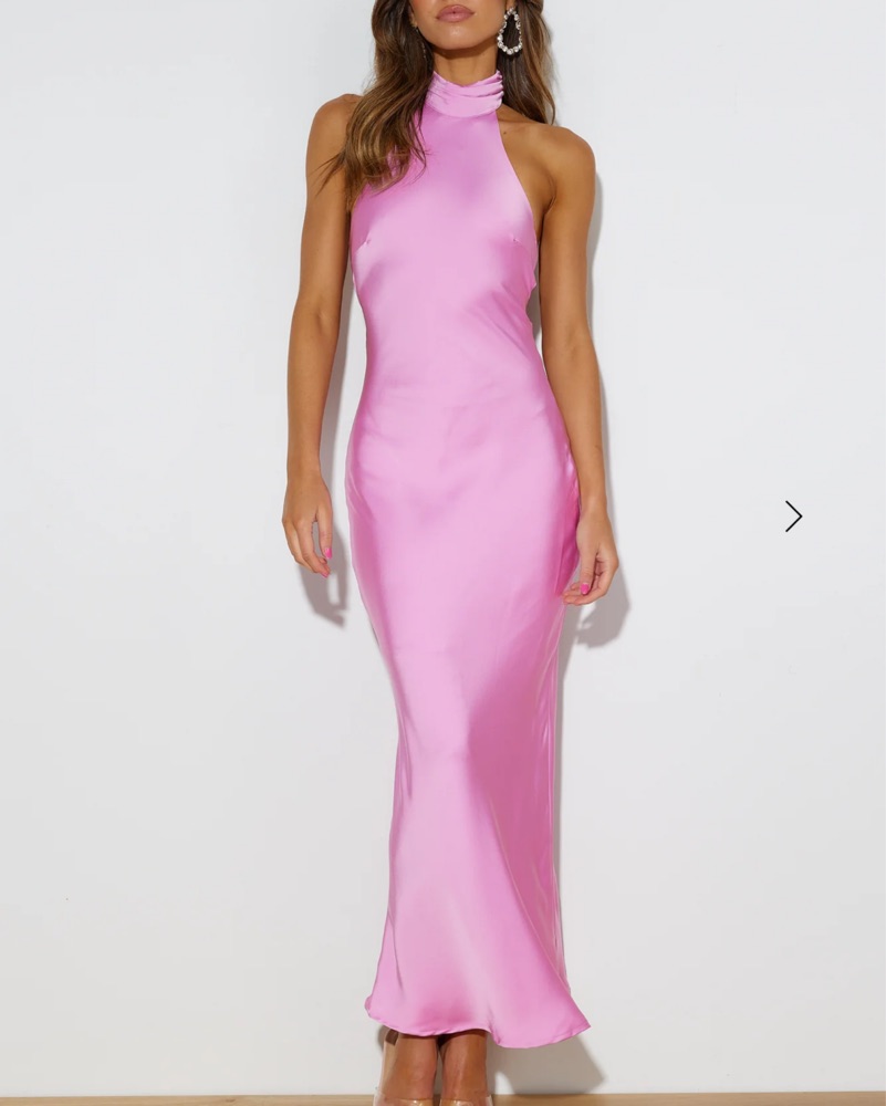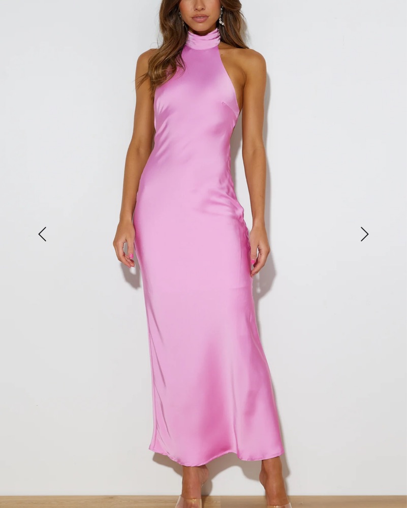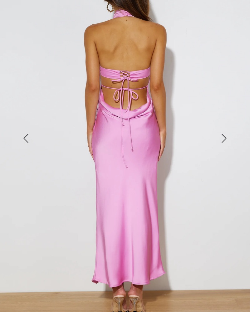 This stunning satin gown set is perfect for a formal event or special occasion. The pink color and elegant silhouette create a glamorous look especially because of the low back.
