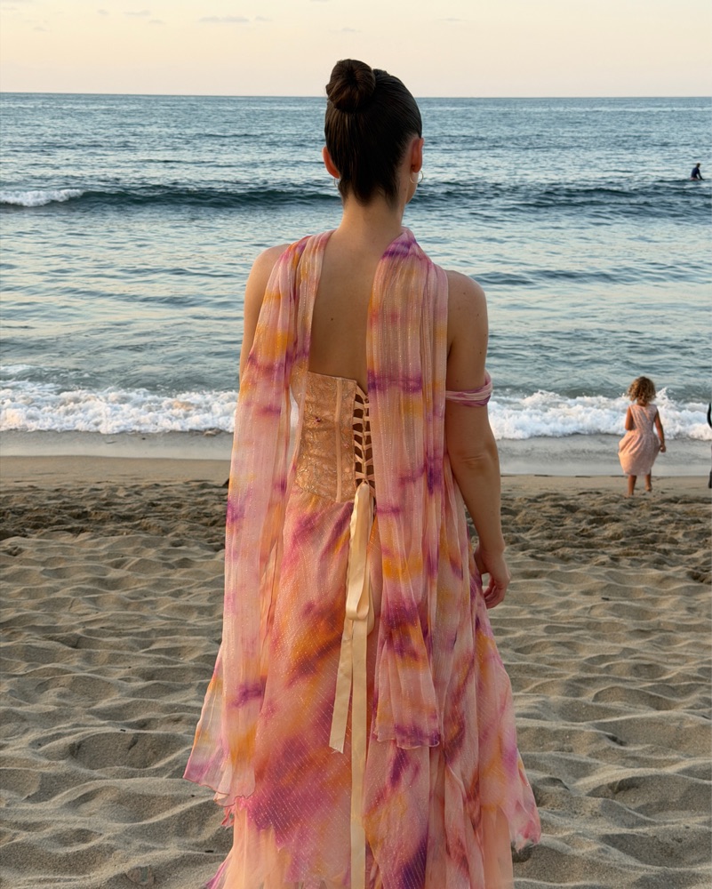 Designer is Belinda's Designs. Fits xs-medium since the top is an adjustable corset. Perfect for a tropical getaway or beach wedding