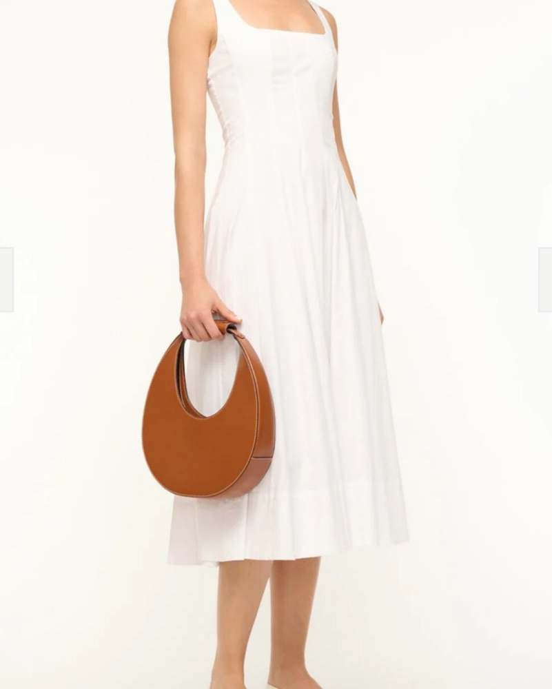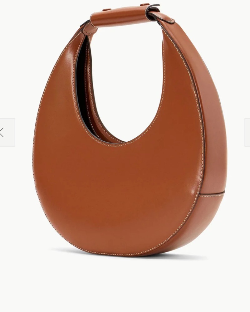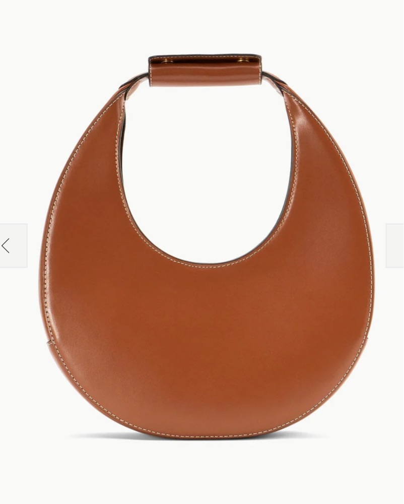 The Moon Bag is a crescent moon shaped tote with a curved handle with removable STAUD-embossed accent. This style features an inner suede lining and a magnetic clasp closure to hold your essentials; can be worn handheld or over the shoulder.