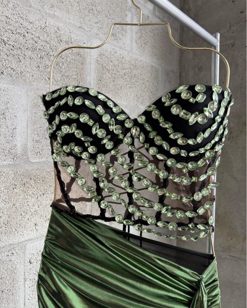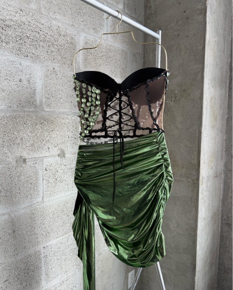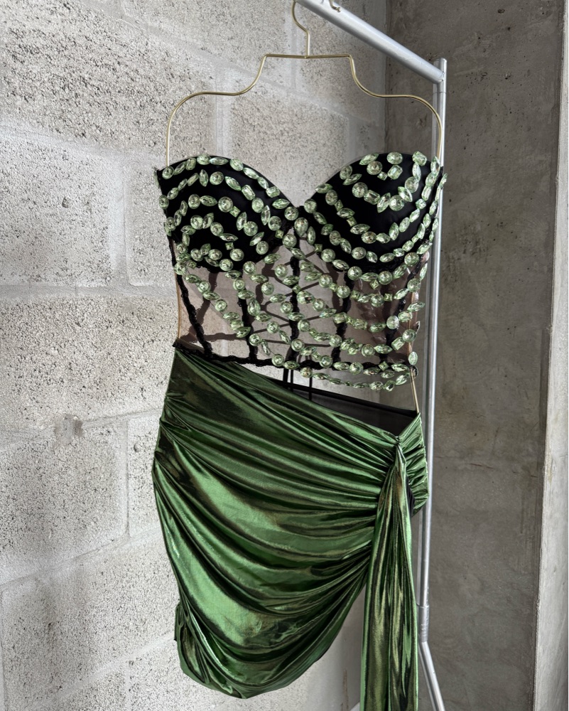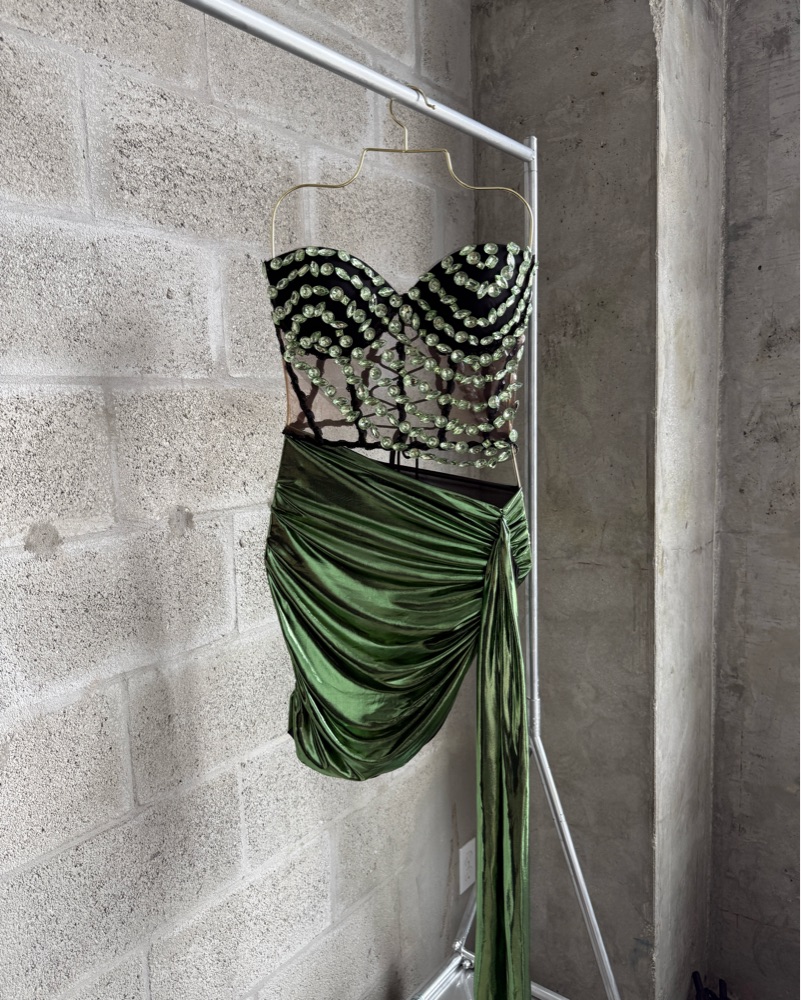 Green strapless mini dress with embellishment and silky draped high cut bottom.