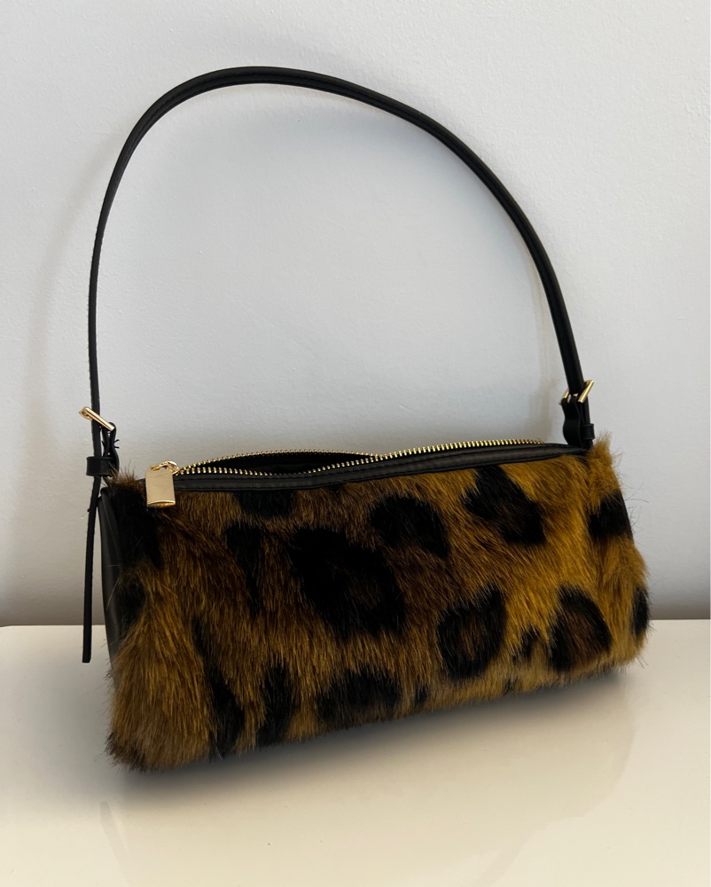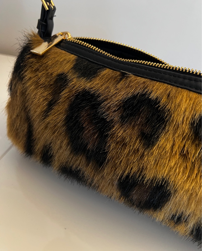 This stylish leopard print faux fur clutch is perfect for adding a touch of glamour to any outfit. Pair it with a sleek black dress and heels for a night out.