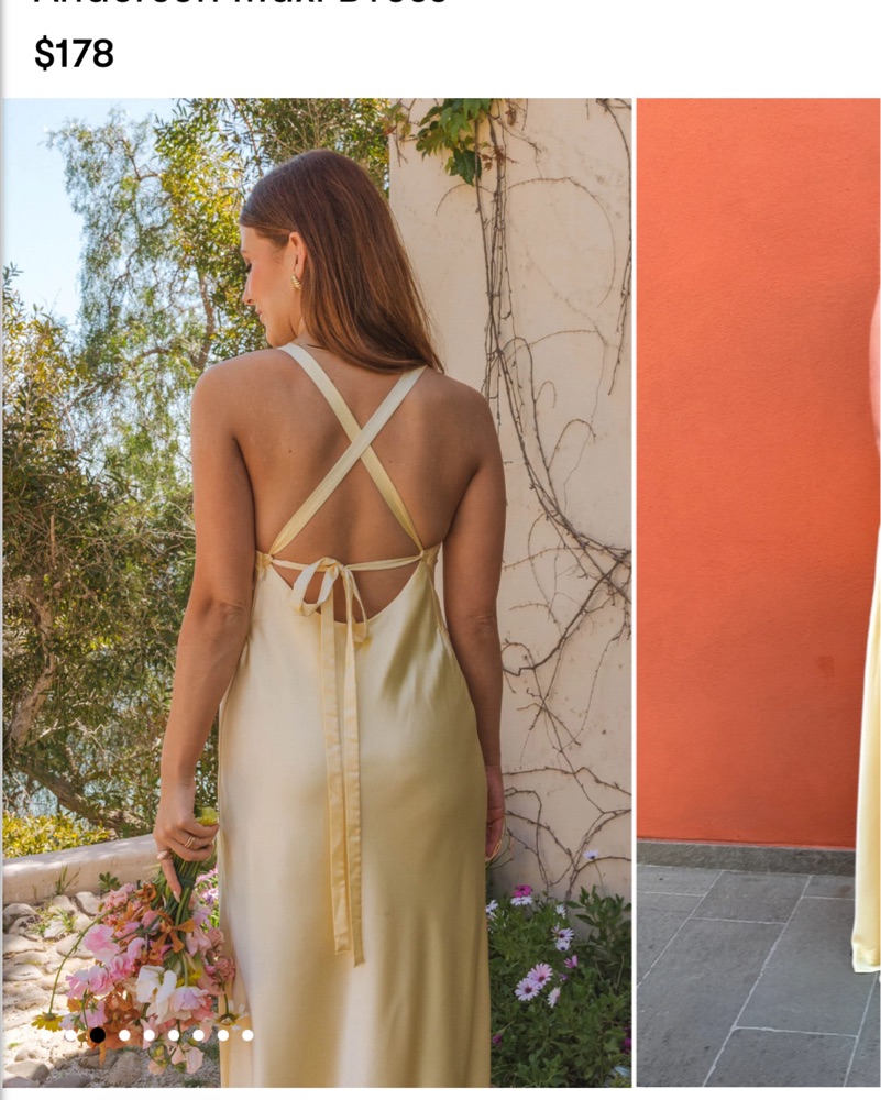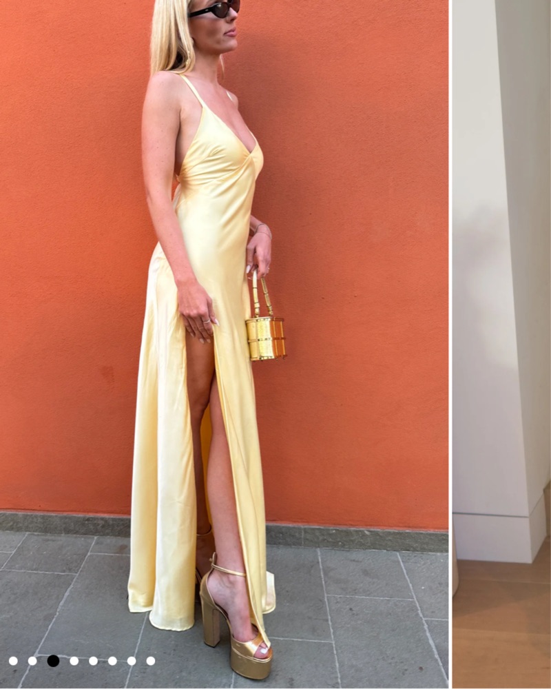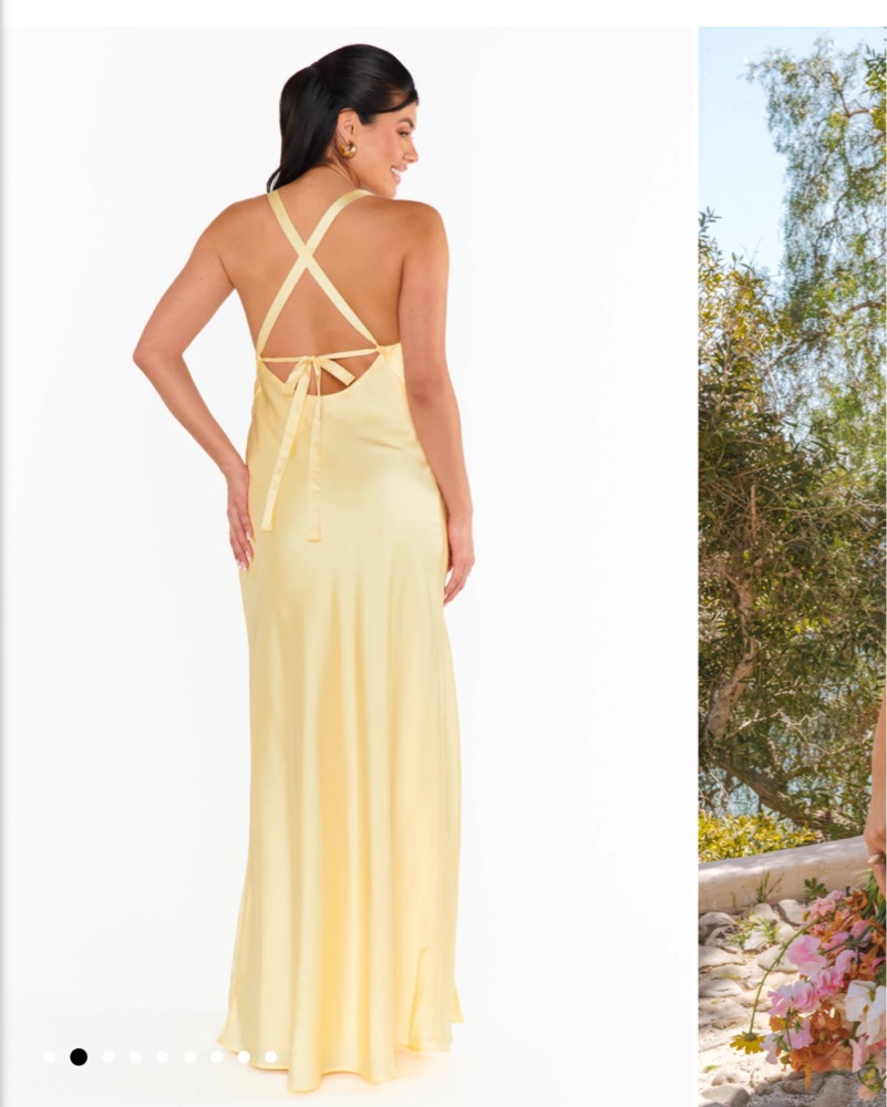 Anderson Maxi Dress – Pale Yellow. Elegant satin maxi with a flowing silhouette, perfect for weddings, bridesmaids, or special occasions. Worn once & so comfortable and easy to move in.
