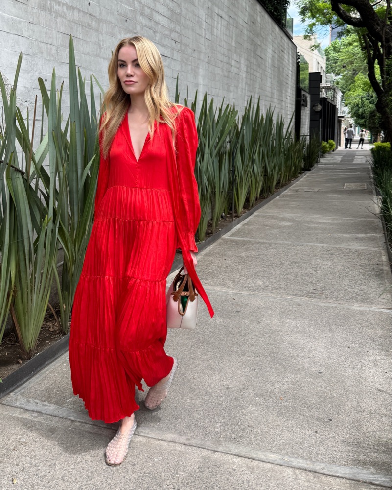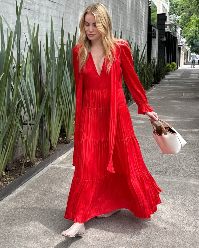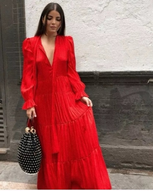 Caftan style pleated dress. It’s made from polyester so it does not wrinkle. Such an easy throw on piece that I have taken with me to Cuba and Mexico City. I’m 5’7” and it is the perfect ankle length on me.