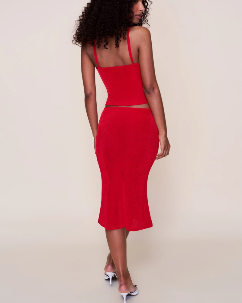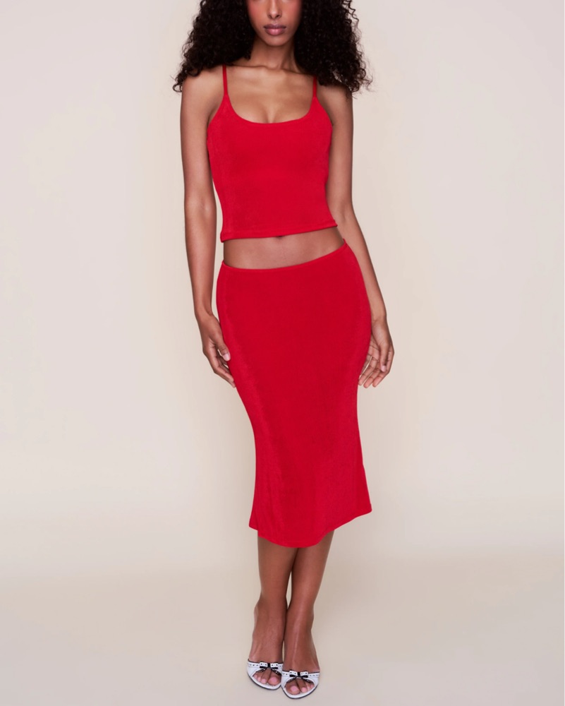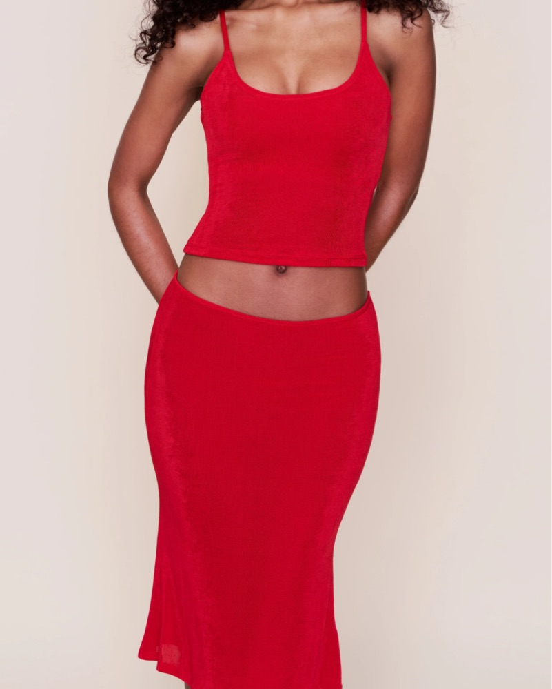 This striking red set is perfect for a night out or a special occasion. The cropped top and fitted midi skirt create a flattering and stylish look.