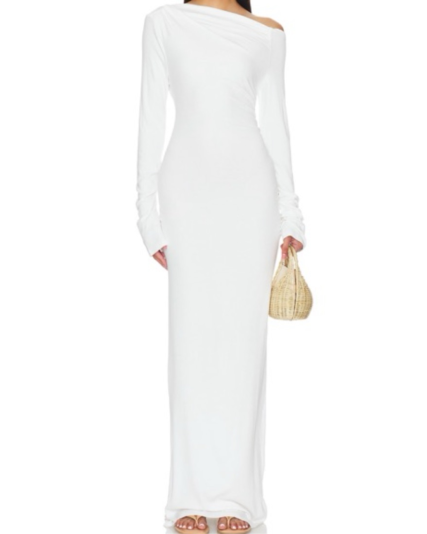 This stunning white maxi dress is perfect for any occasion as it can be dressed up or down. The fitted silhouette and ruched detailing create a flattering, sophisticated look.