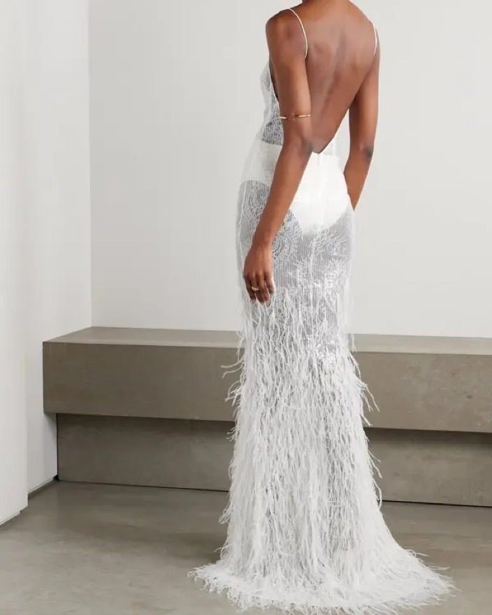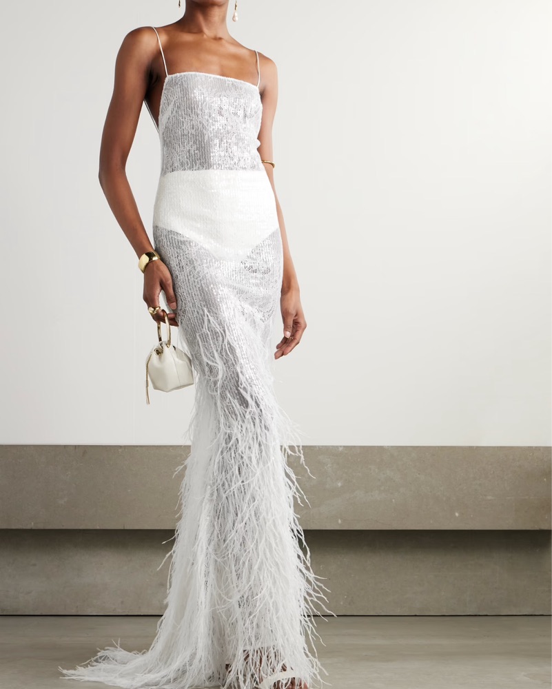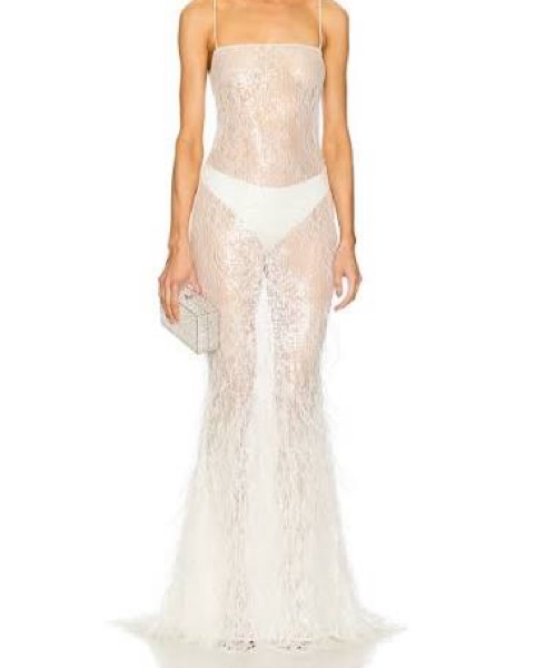 Brand new and stunning white Odessa gown by Retrofete. The dress is adorned with lace and white sequins on the bodice, and ostrich feathers on the skirt train. Tailored to fit a size XS 0-2