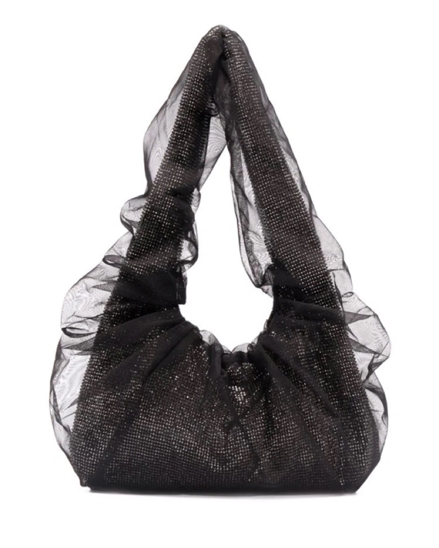 Beautiful bag with tulle lining and a crystal mesh iridescence. Crystal mesh is black colored
