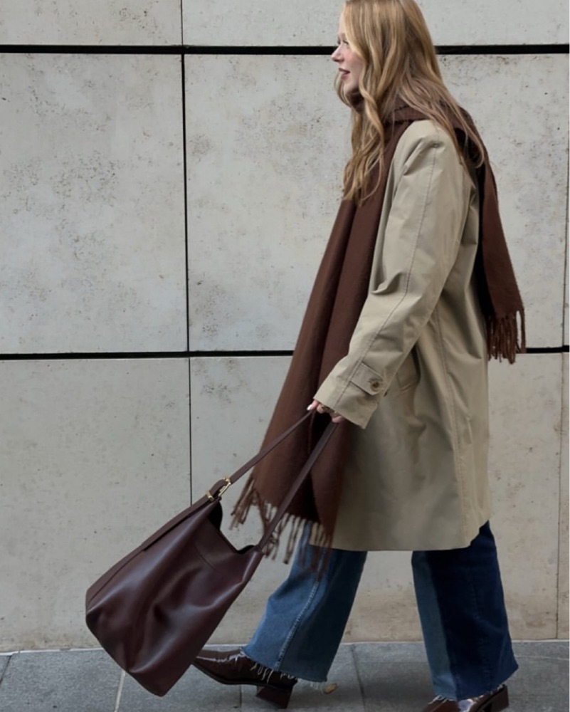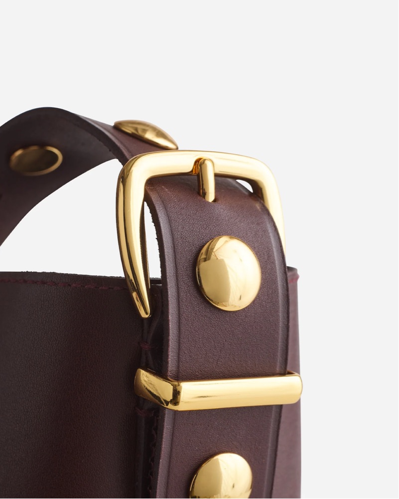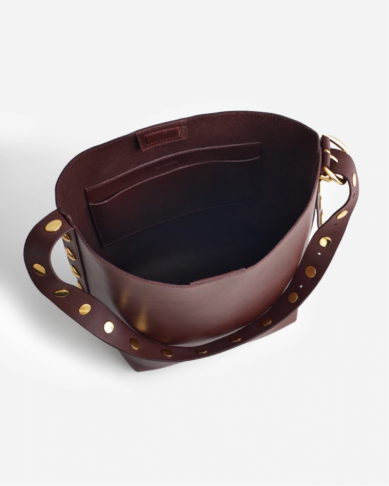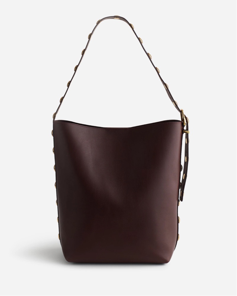 Studded shoulder bag in a dark brown leather. With a magnetic closure and interior pocket, this studded-embellished suede bucket tote is perfectly sized to hold up to a 15" laptop, water bottle, phone, wallet, keys and more—plus, it has an adjustable shoulder strap