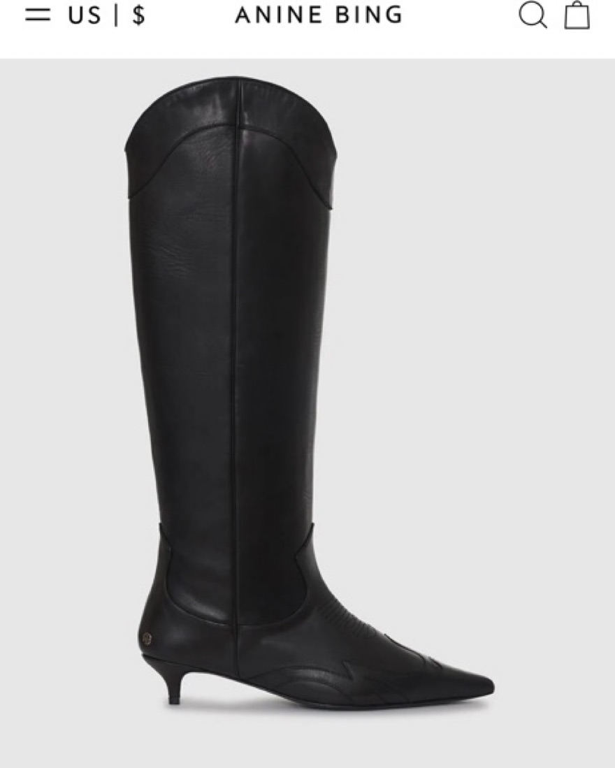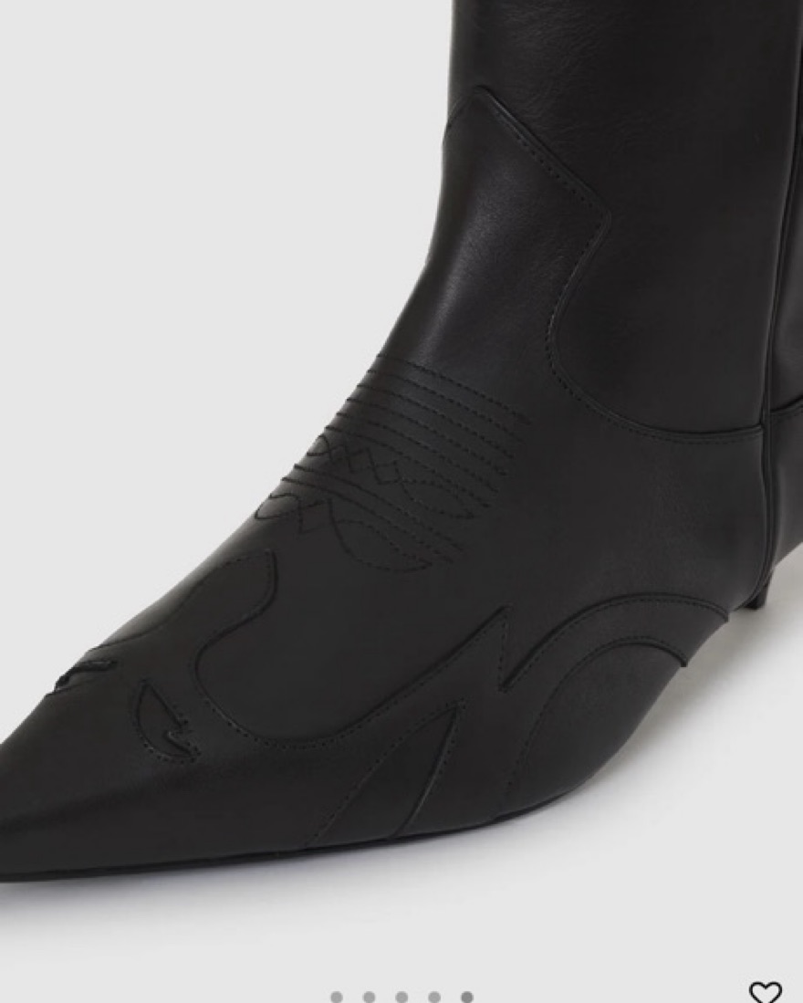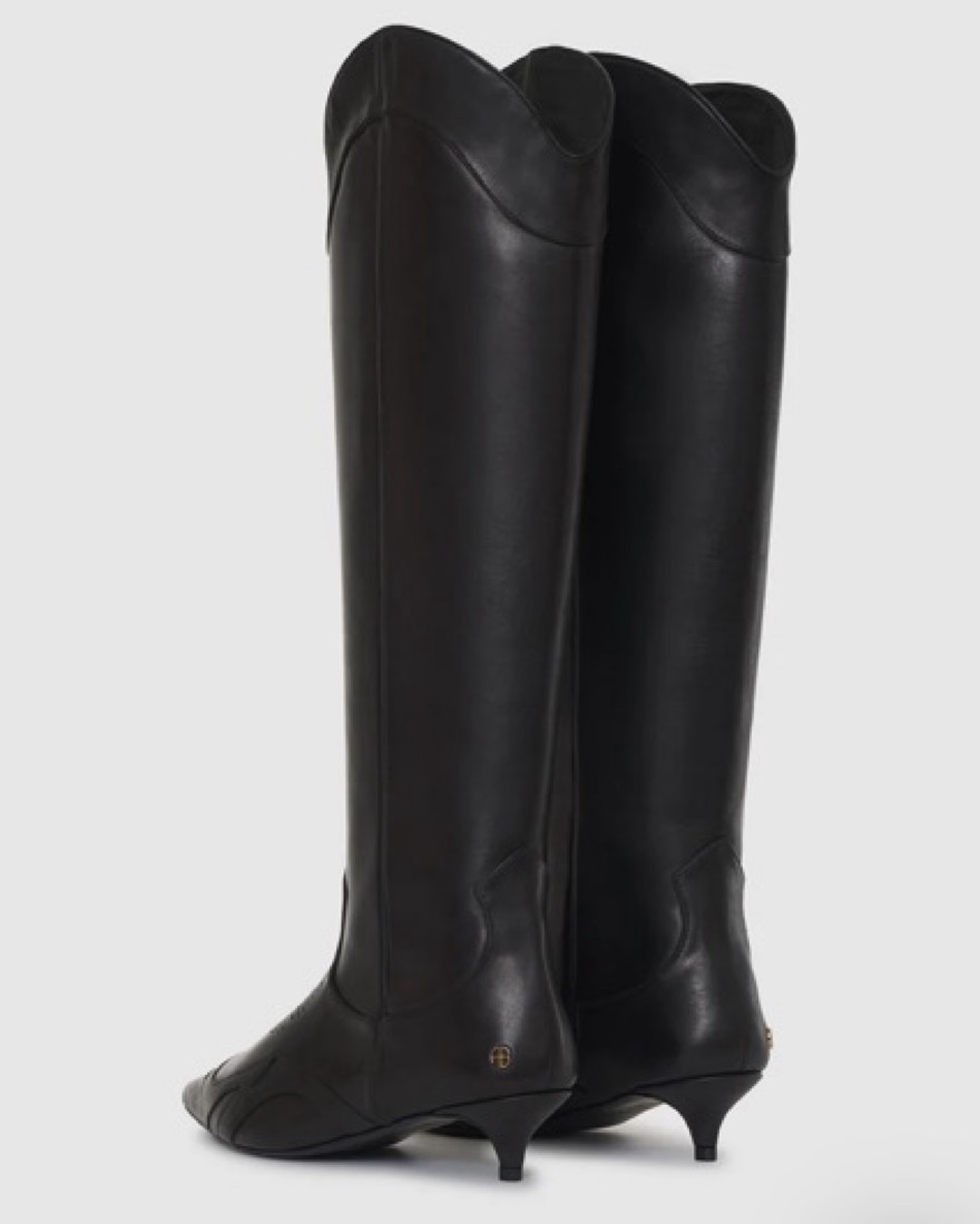 A modern pair of knee-high boots crafted from smooth 100% leather in black elevated with western-inspired applique detailing at the toe and piping along the shaft. The Tall Rae Boots feature a slip-on construction with a sharp pointed toe, understated kitten heel, and anti-slip sole.