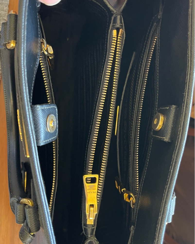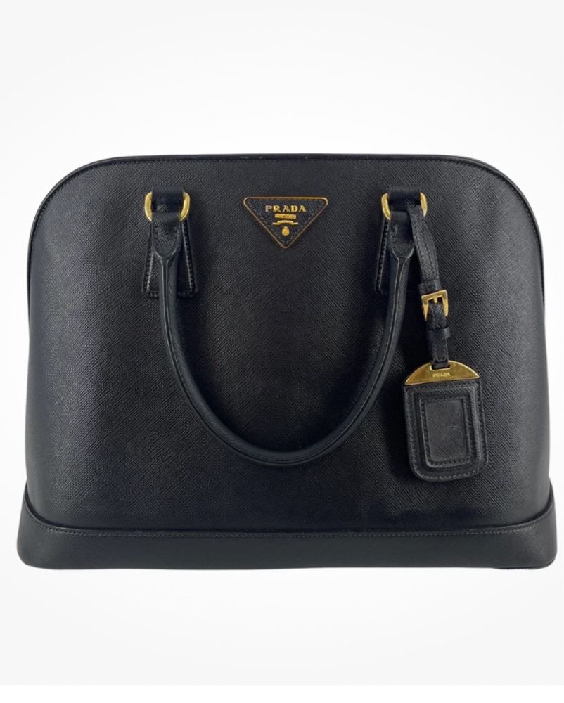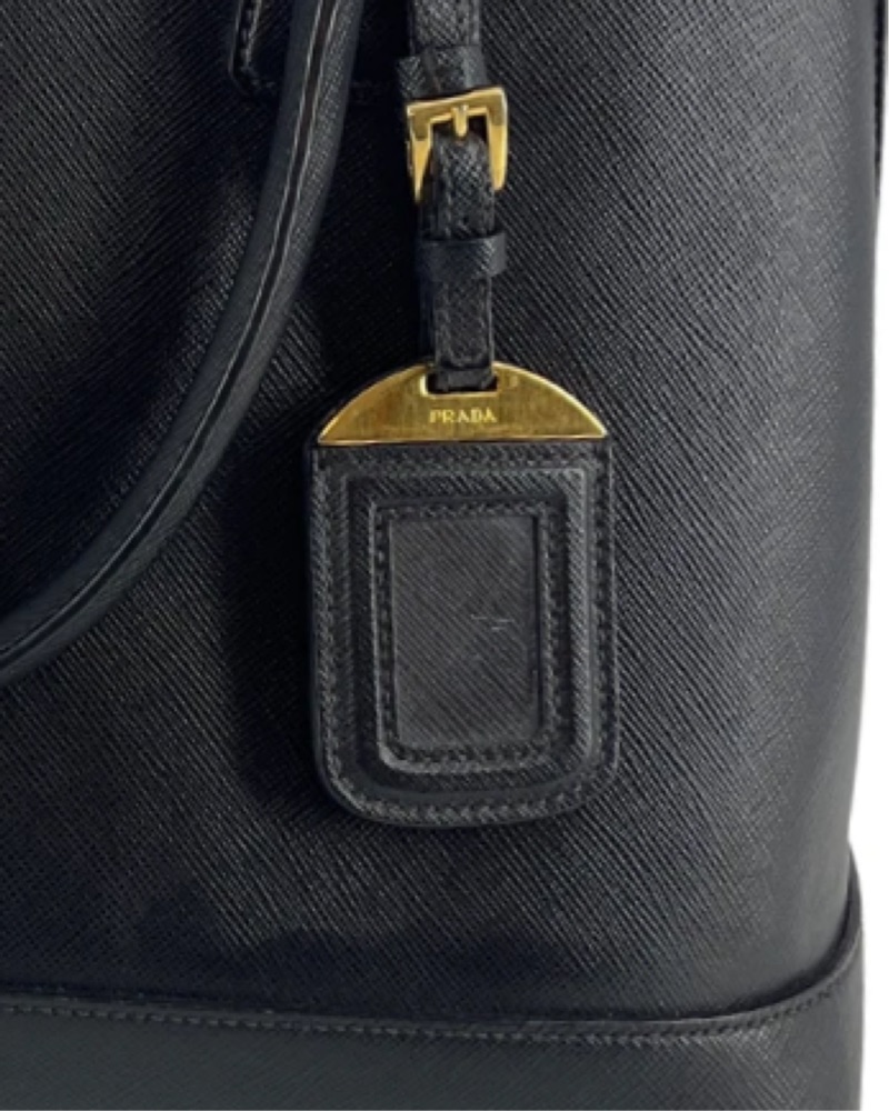 Go-to statement bag for an evening out. Bag opens with a snap closure. The iconic metal logo sits on a leather triangle for an iconic look. This bag also features a luggage tag. The interior is lined with classic Prada jacquard textile lining.