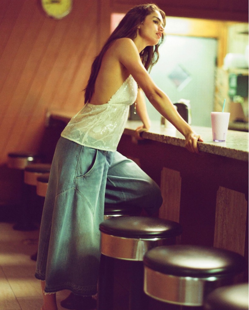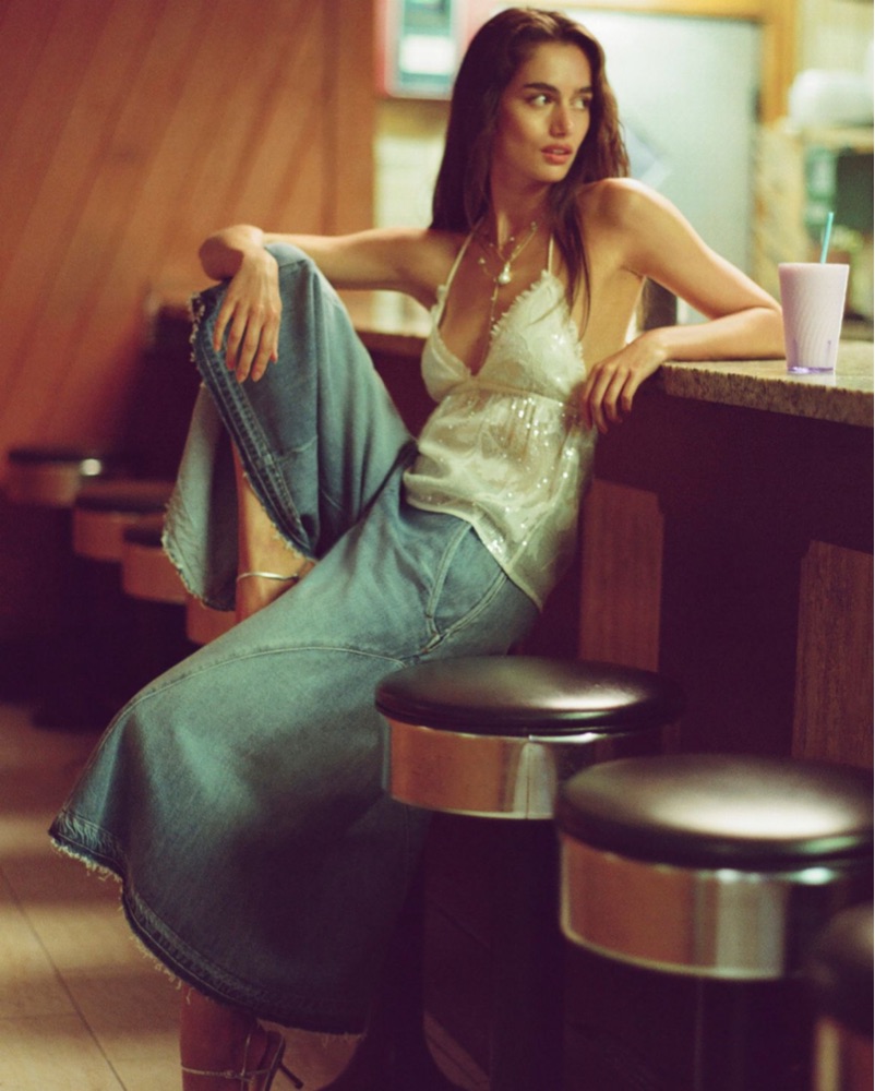 This chic and glamorous outfit is perfect for a night out on the town. The sparkling sequin halter top adds a touch of elegance, while the distressed wide leg jeans give a casual, edgy vibe.