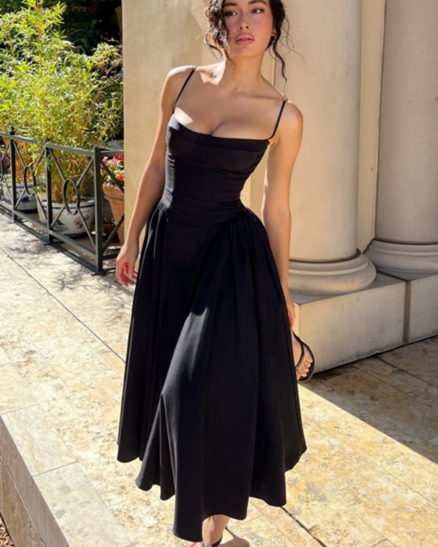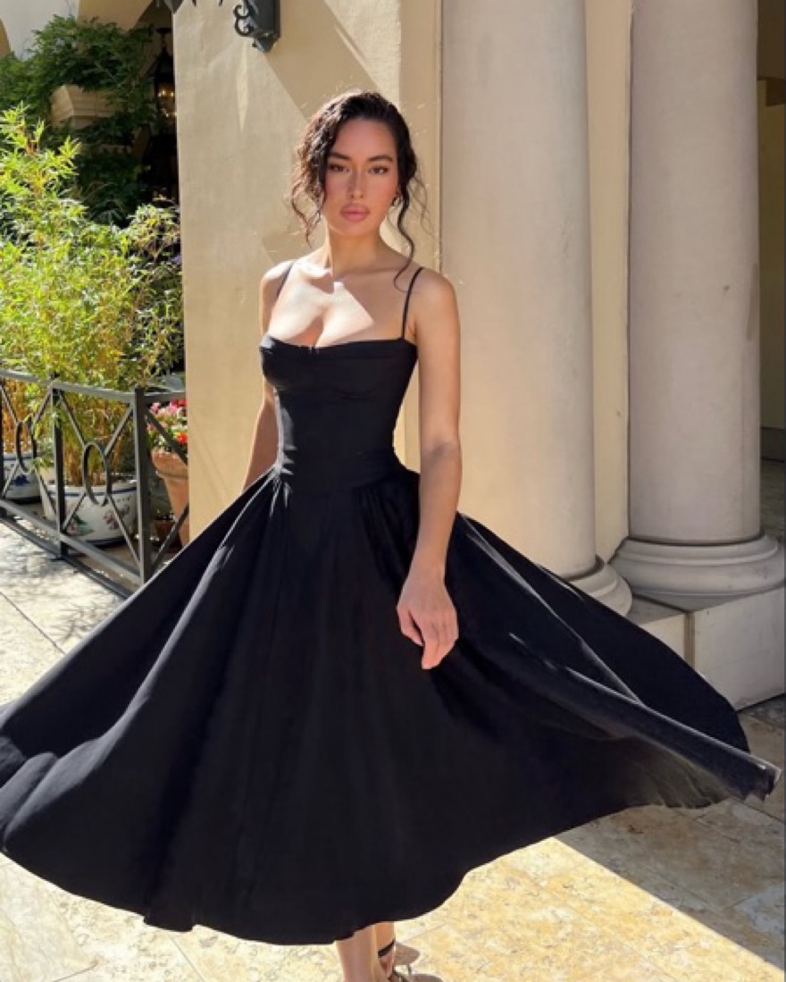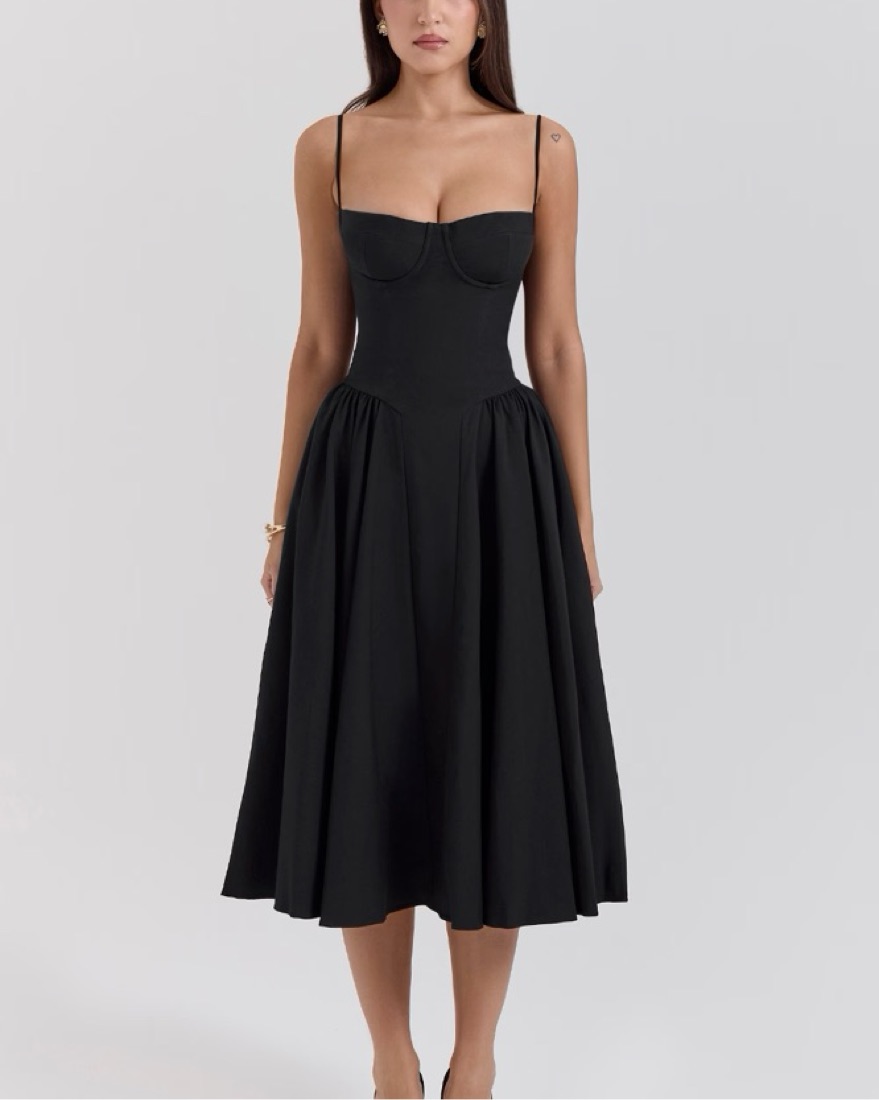 This stunning black midi dress is perfect for a formal event or special occasion. The structured bodice and full, pleated skirt create a flattering and sophisticated silhouette. Small + with bigger cups