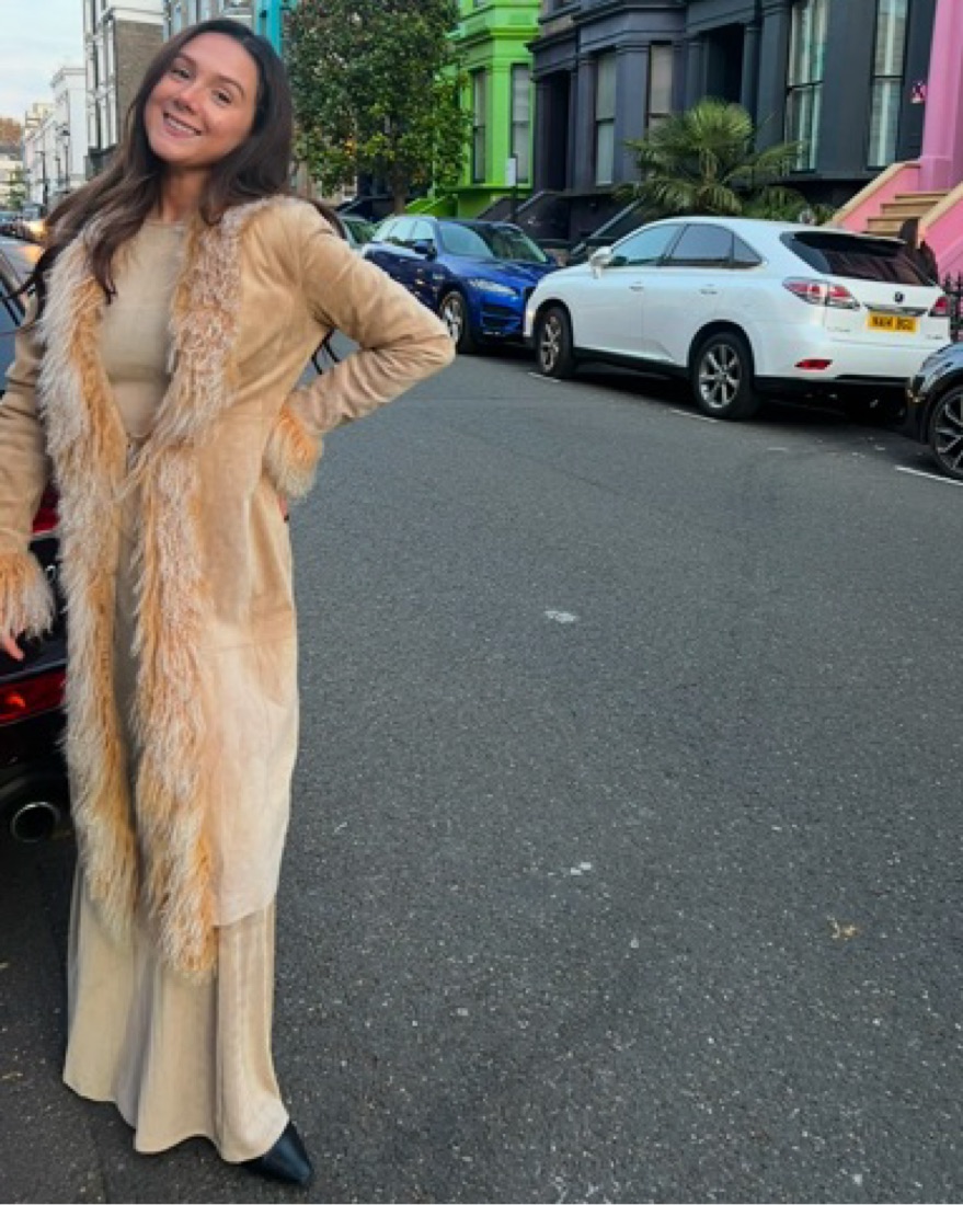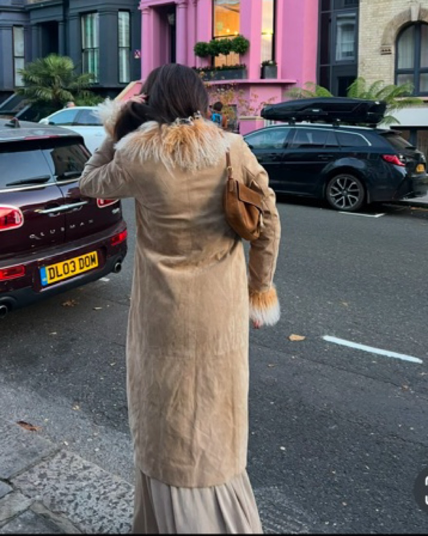 long, tan, suede Vintage 70s “Penny Lane” Coat. very warm! sourced in Knotting Hill in London.