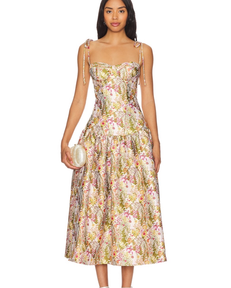 Striking midi dress is perfect for a summer wedding or garden party. The vibrant floral print and flowing silhouette create a romantic, feminine look.