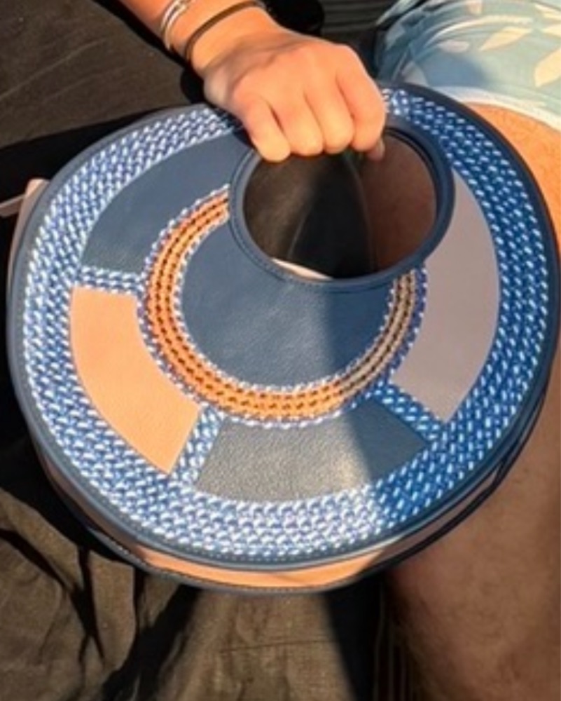 - Decorative stitched/rattan trim around the handle