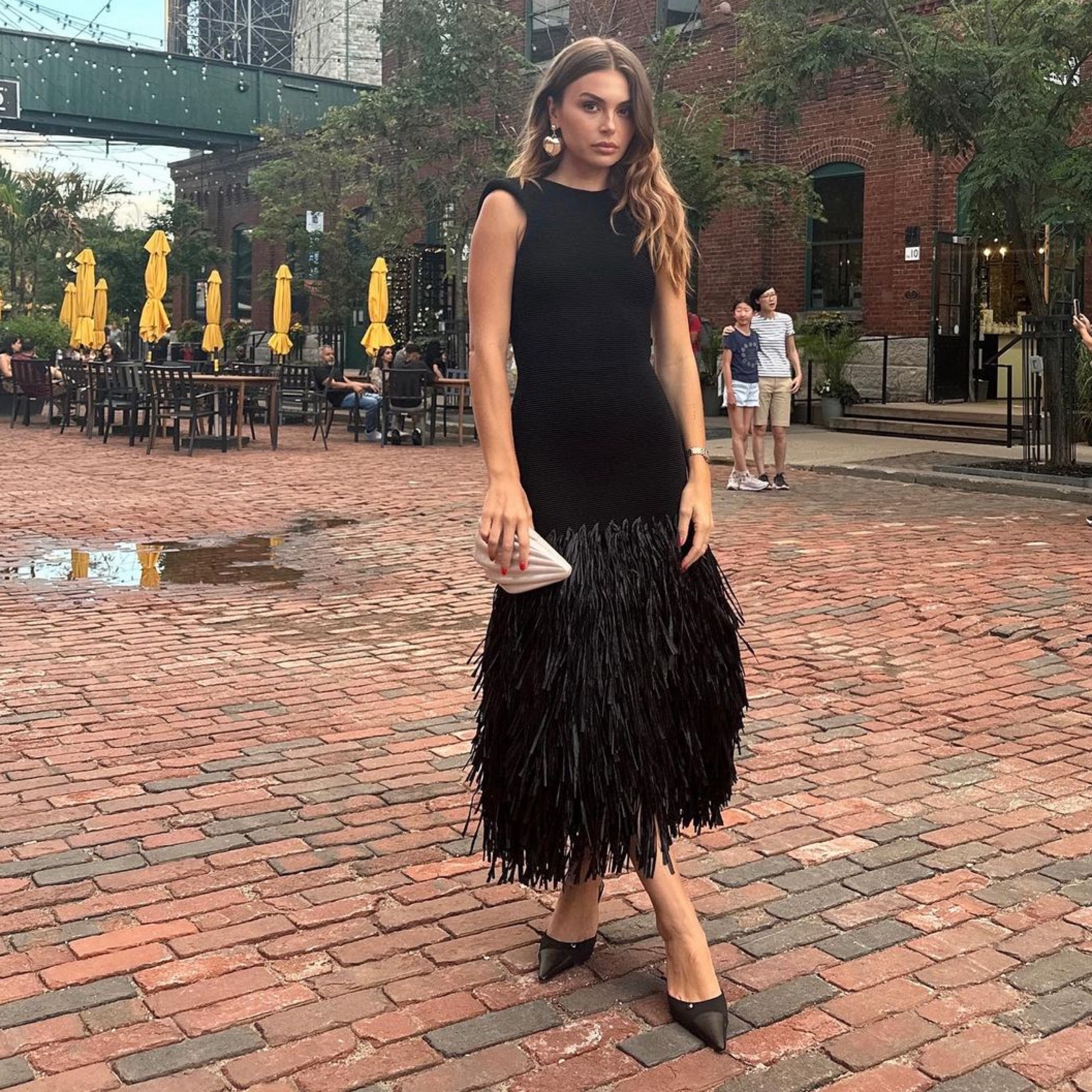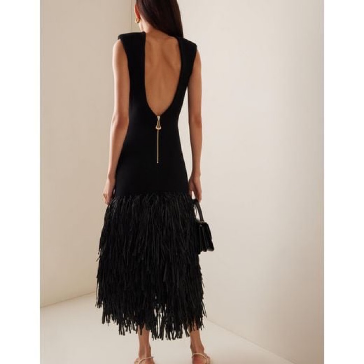 Thick knit dress with a dropped open back and raffia fringe