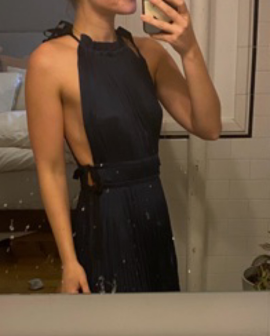 it’s crafted from silky-smooth plissé satin in a deep navy that exudes elegance and sophistication. It features drawstring ties at the neck and waist and a gracefully pleated maxi silhouette.