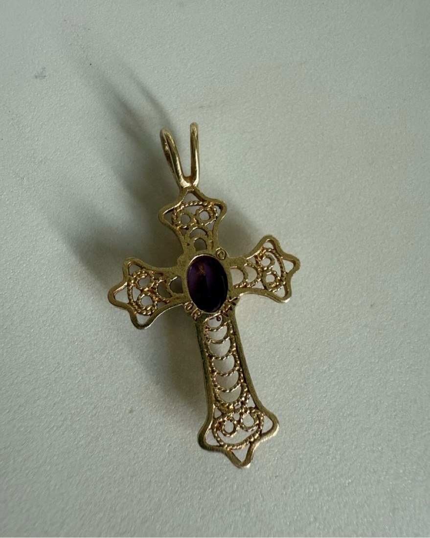 Solid 14k god French filigree amethyst cross pendant.