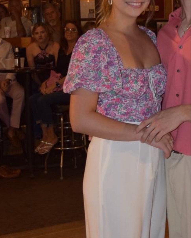 Top has been very well taken care of and only worn a couple of times. Looks brand new and is very flattering! Back has a zipper and button. Top is a Medium but runs really small, I am usually a size small top.