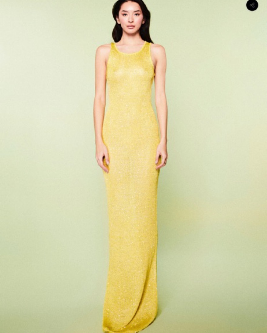 Yellow (chartreuse) sequin crochet knit dress by vacationwear brand asta resort. Gorgeous shimmering fabric and fitted long cut thats perfect for vacation or a special event. Please note: it has some pulls & damage & stains on bottom - not super noticeable when wearing/in photos. See reviews.