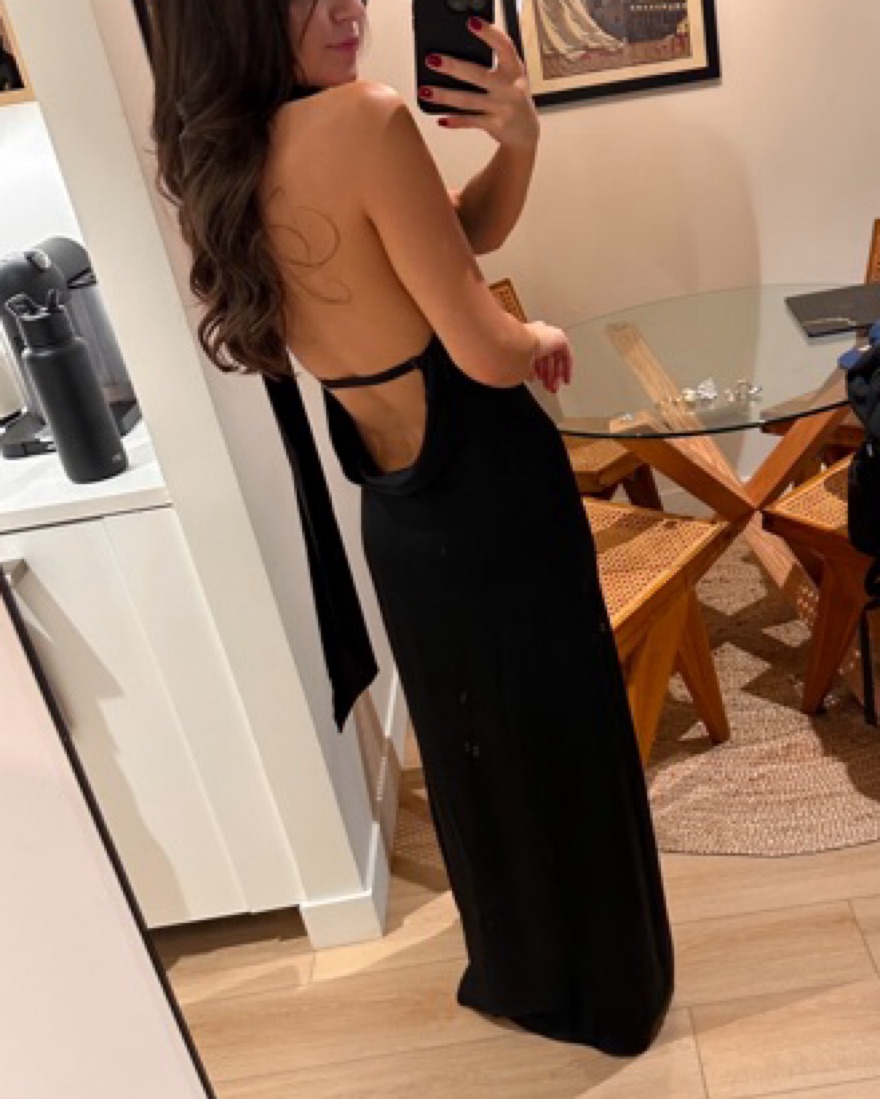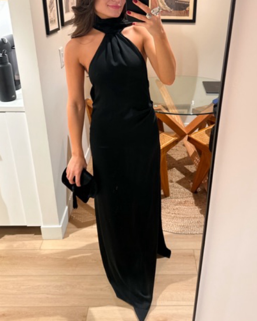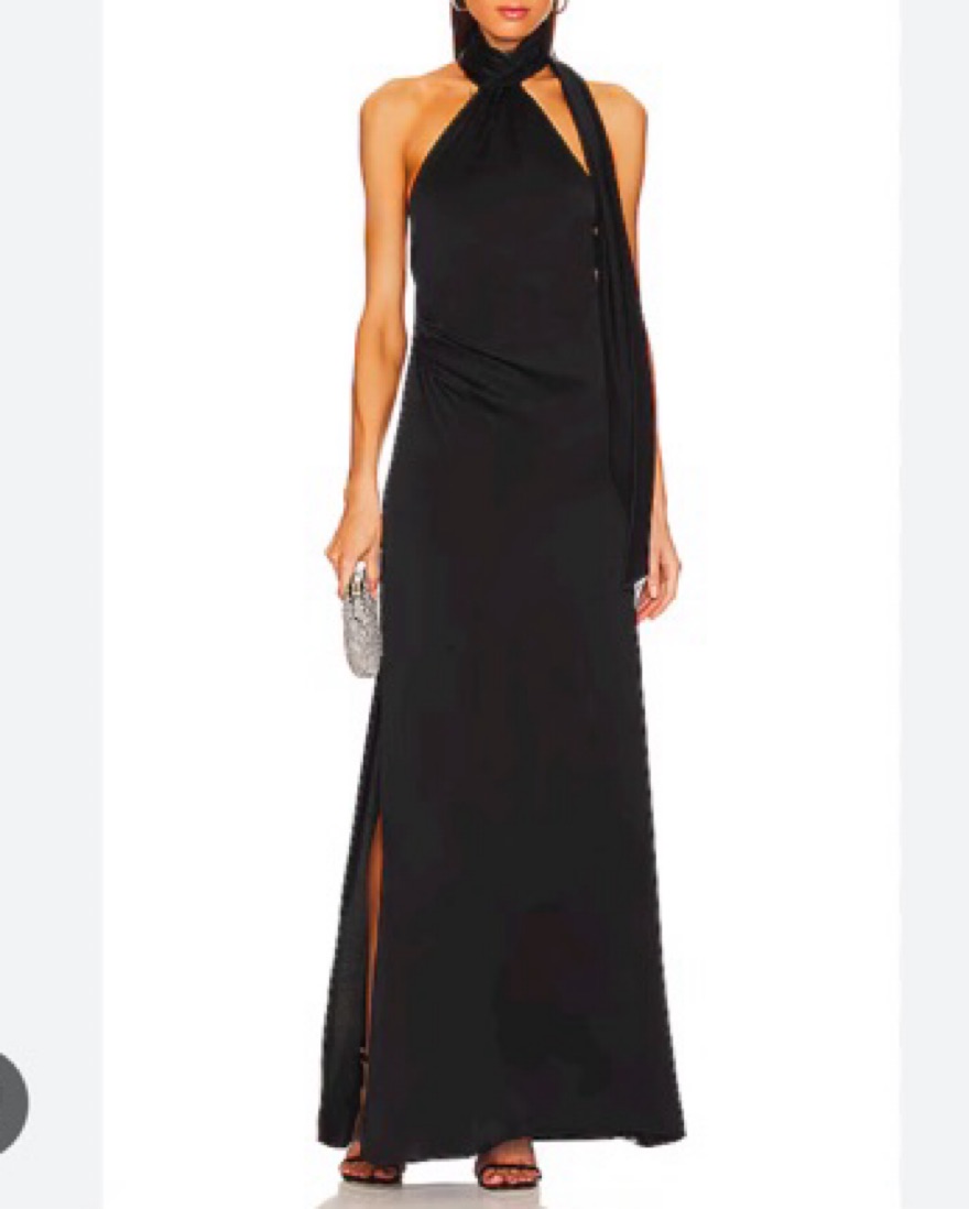 Black silk gown with low open back and neck scarf and leg slit. Loop button closure on mockneck. Adjustable strap at back. Pictured on 5’2” frame with 3in heels.