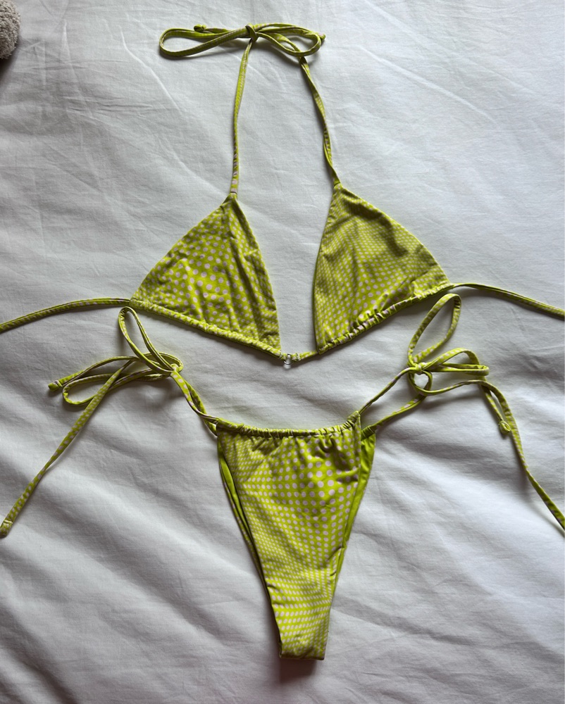 Frankie’s bikinis!!! Green and pink polka dot triangle bikini top and Tia bottoms. Condition is almost brand new, top and bottom both size medium. Perfect for summer :)
