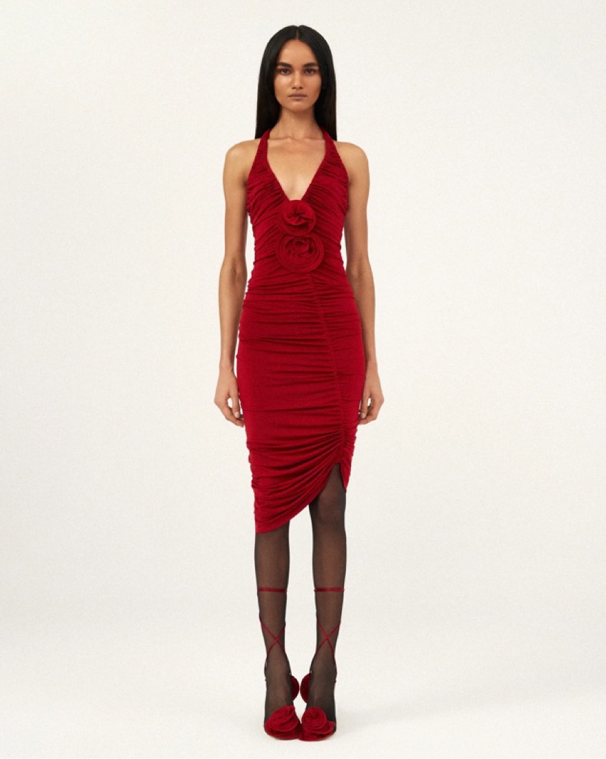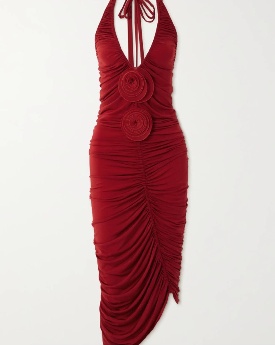 A 2000's inspired jersey dress that hits just below the knee for a midi dress with an updated, asymmetrical hem. The dress has strong ruching throughout and is adorned with 3D flower appliqués, finished with a scoop neckline and thick halter neck that ties in the back. As seen on Hailey Bieber