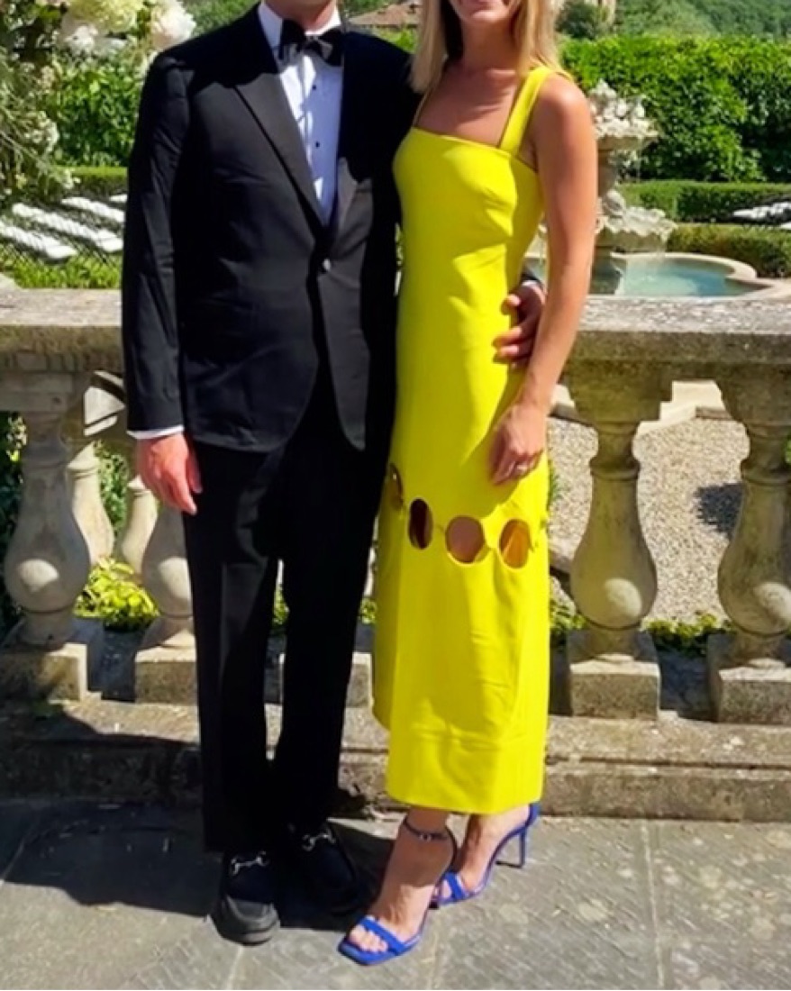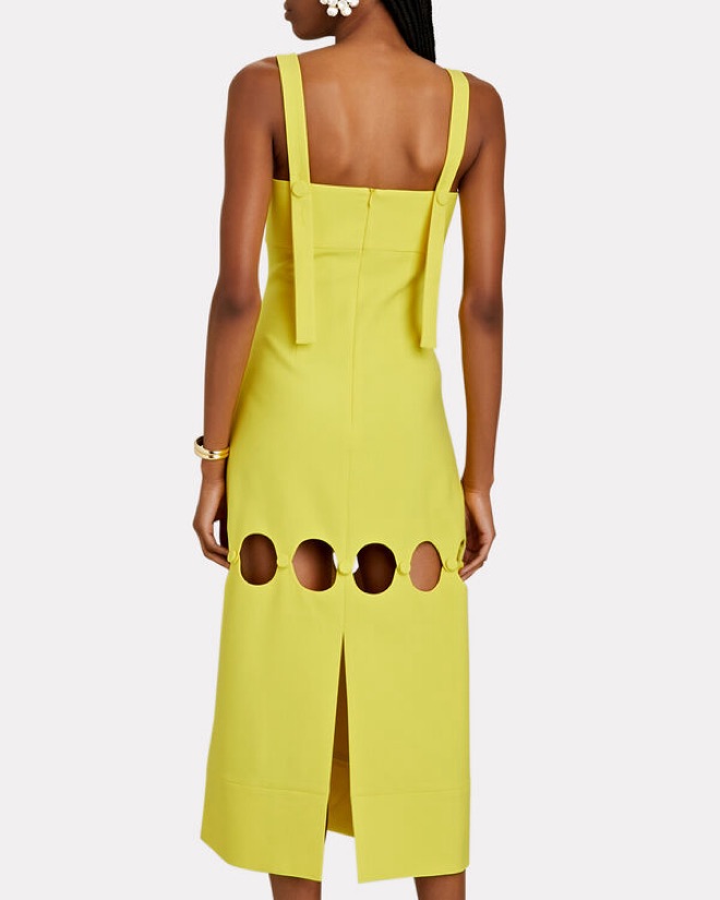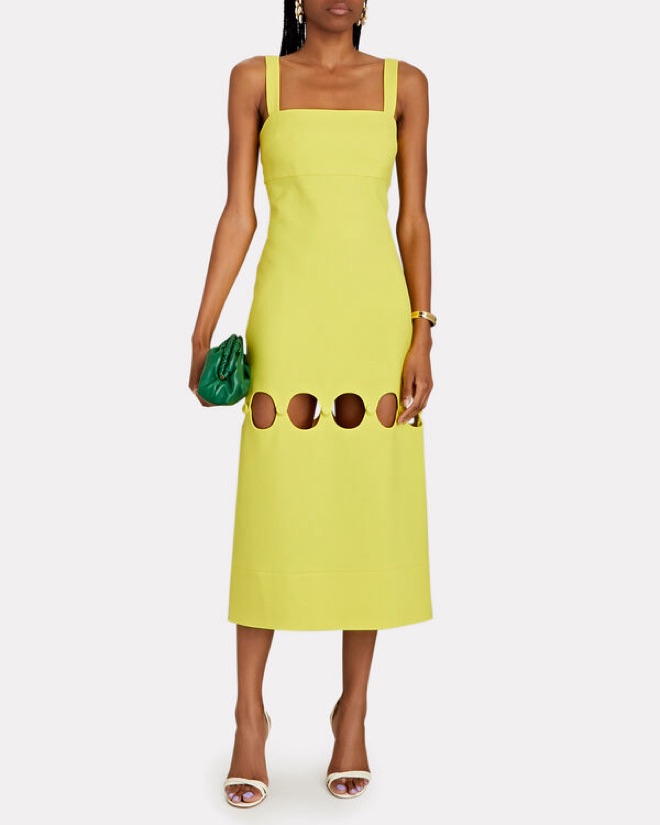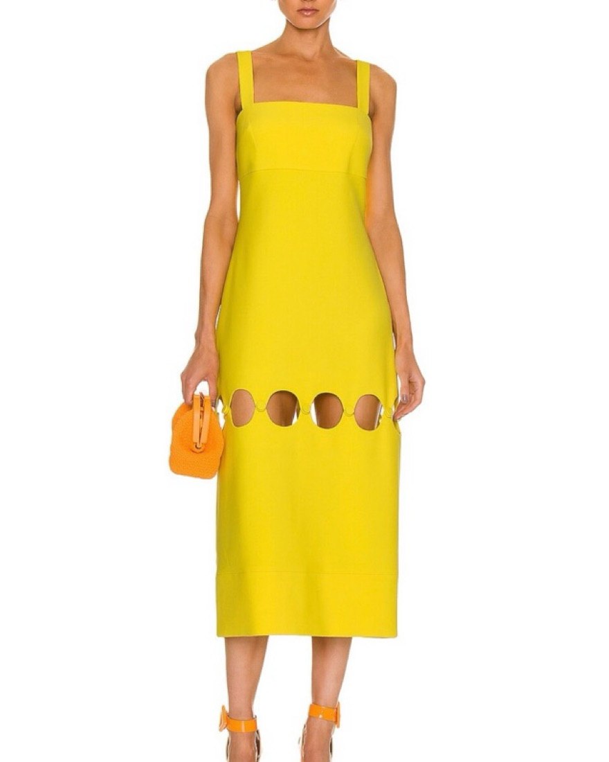 Bright yellow Alexis midi dress with cut-outs. Got so many compliments on this. The first photo is me wearing the dress and I am 5 ft. 5 in., so the cut-outs hit me mid-thigh. I did have cups sewn in (cup size B). Color is a true sun-yellow. Material is a thick poly-viscose blend (structured).