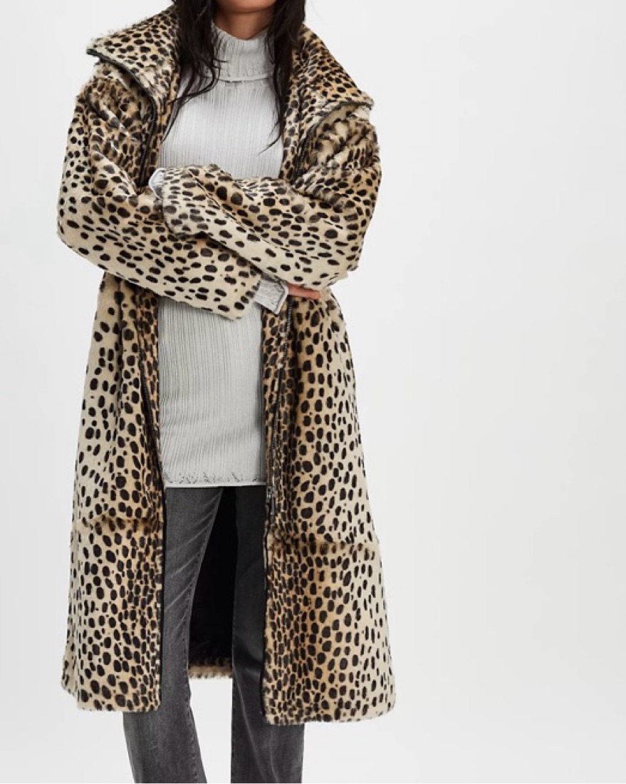 Free people cozy soft faux fur jacket with leopard print design, drop-shoulder sleeves, front-zip closure, exaggerated collar