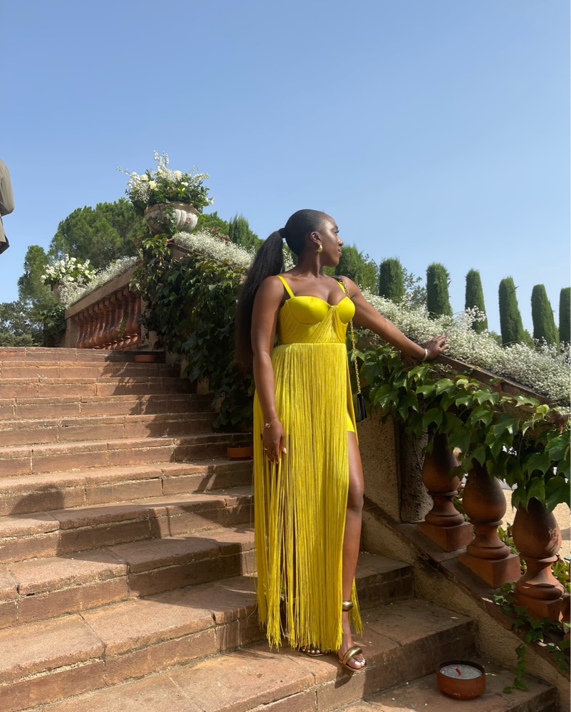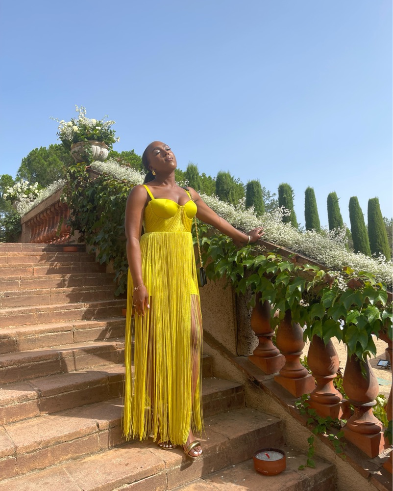 Yellow/green fringe dress from House of CB — the ultimate statement. Gorgeous for weddings or any special events. Size large but fits a medium.