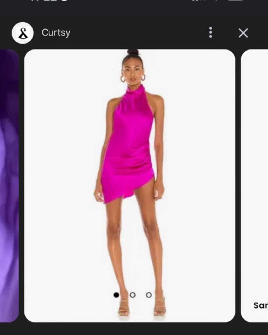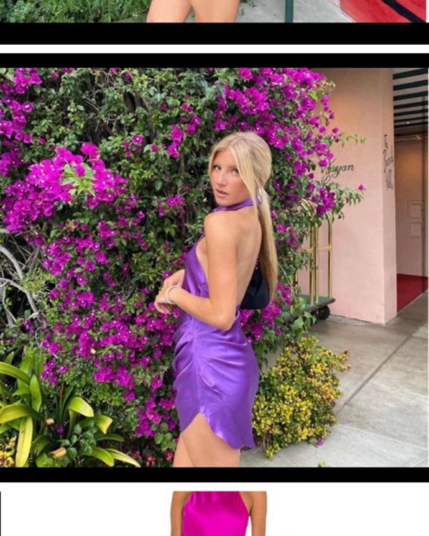 Beautiful silk dress with a high neck, low back and assymetrical bottom. This is the purple color in the first pick. Also available in red