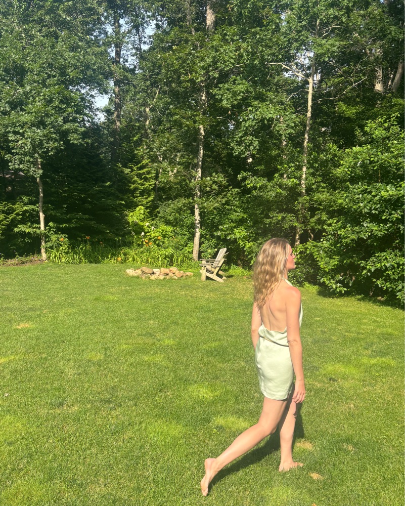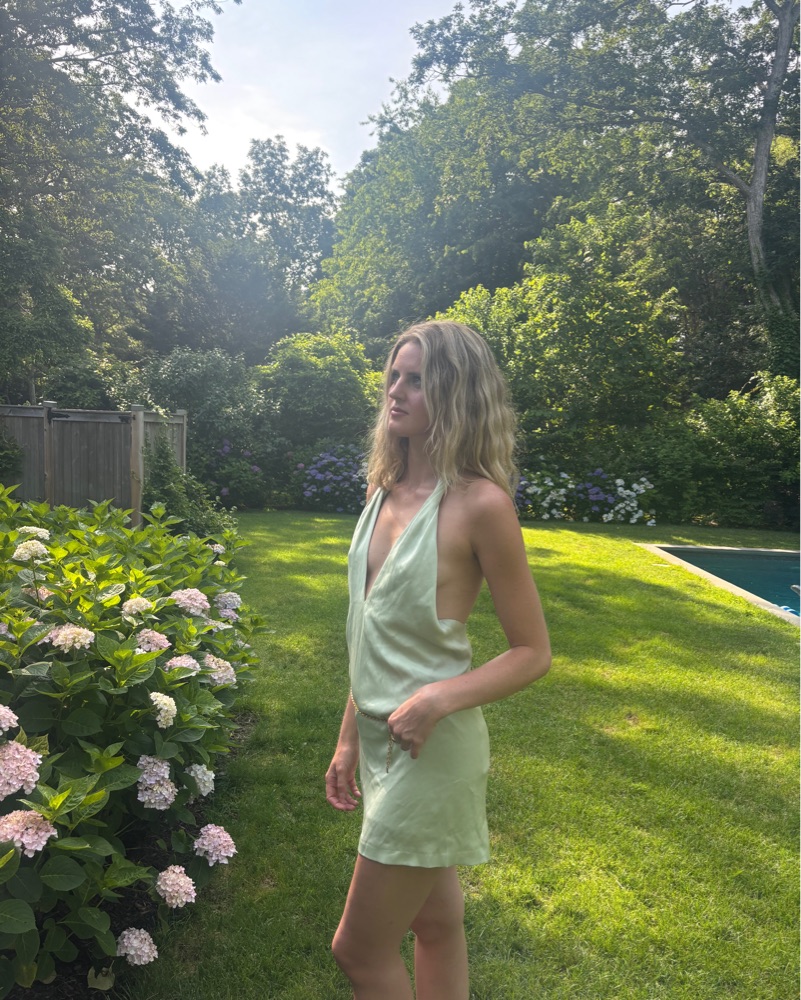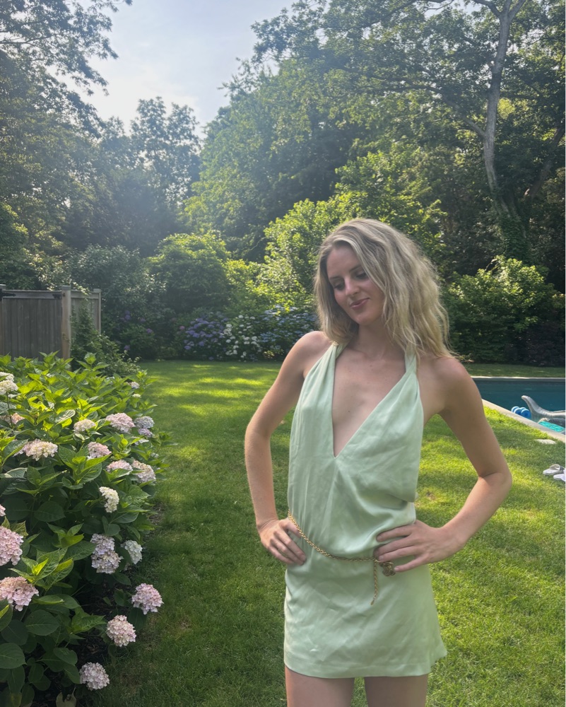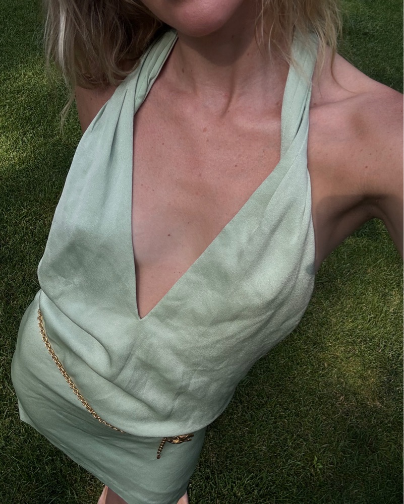 This mint green/ sea foam dress is so cute for summer, it’s halter neck with a plunging neckline. It’s backless and I added a belt to shorten a bit.