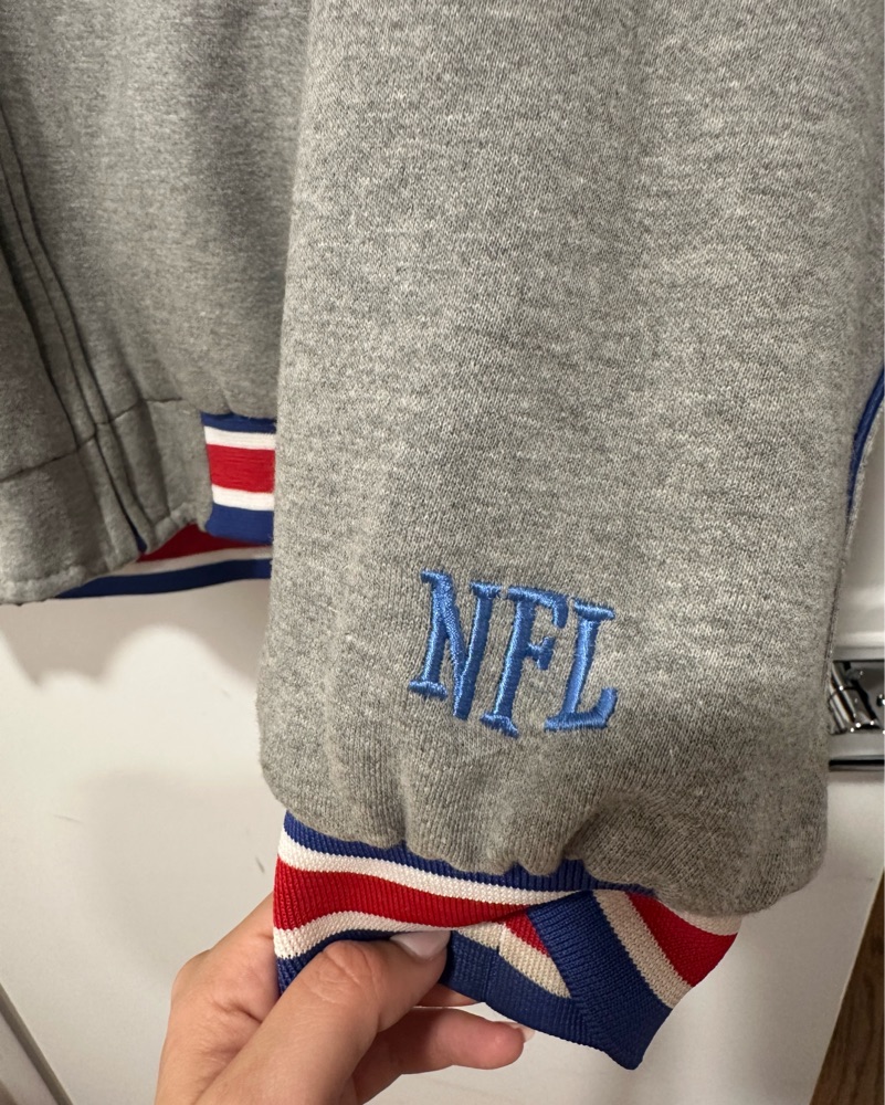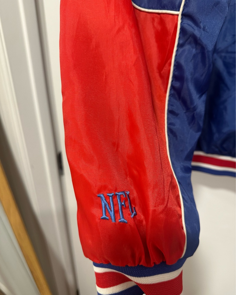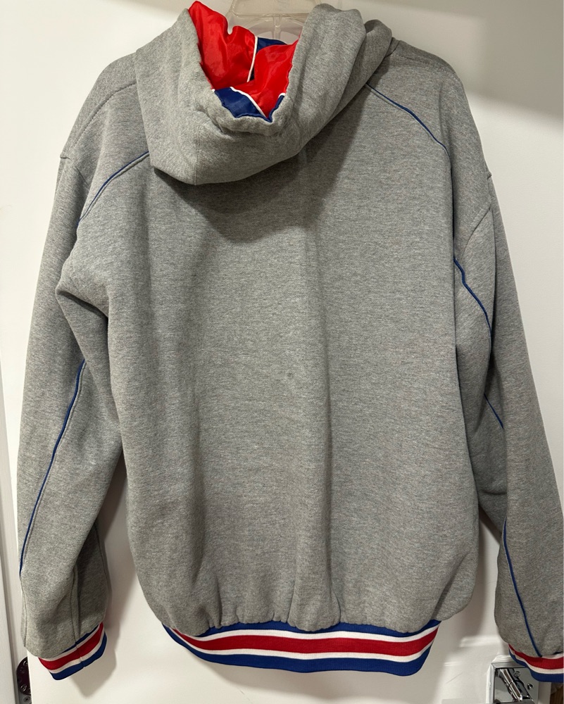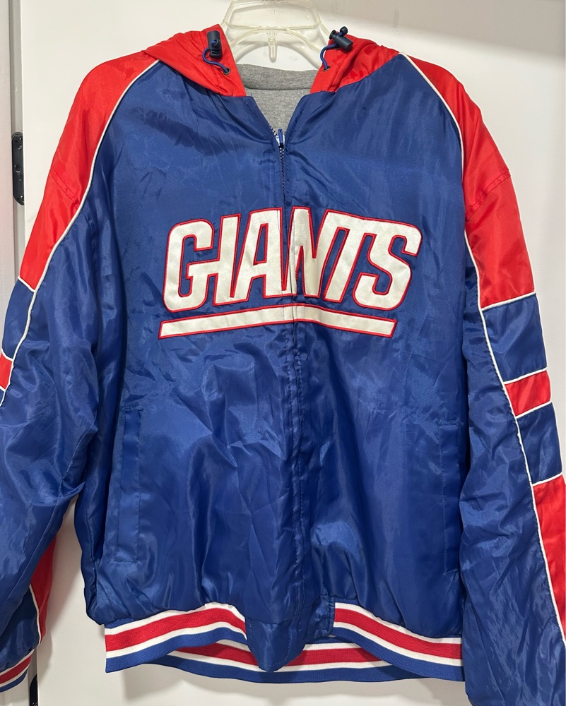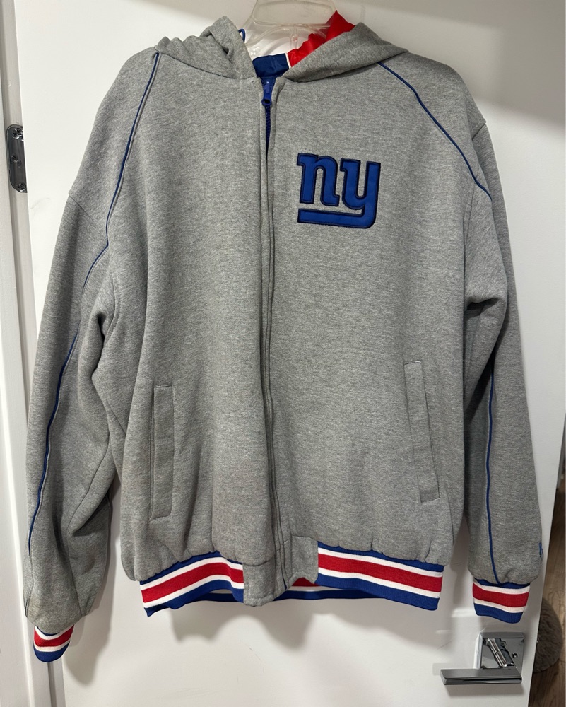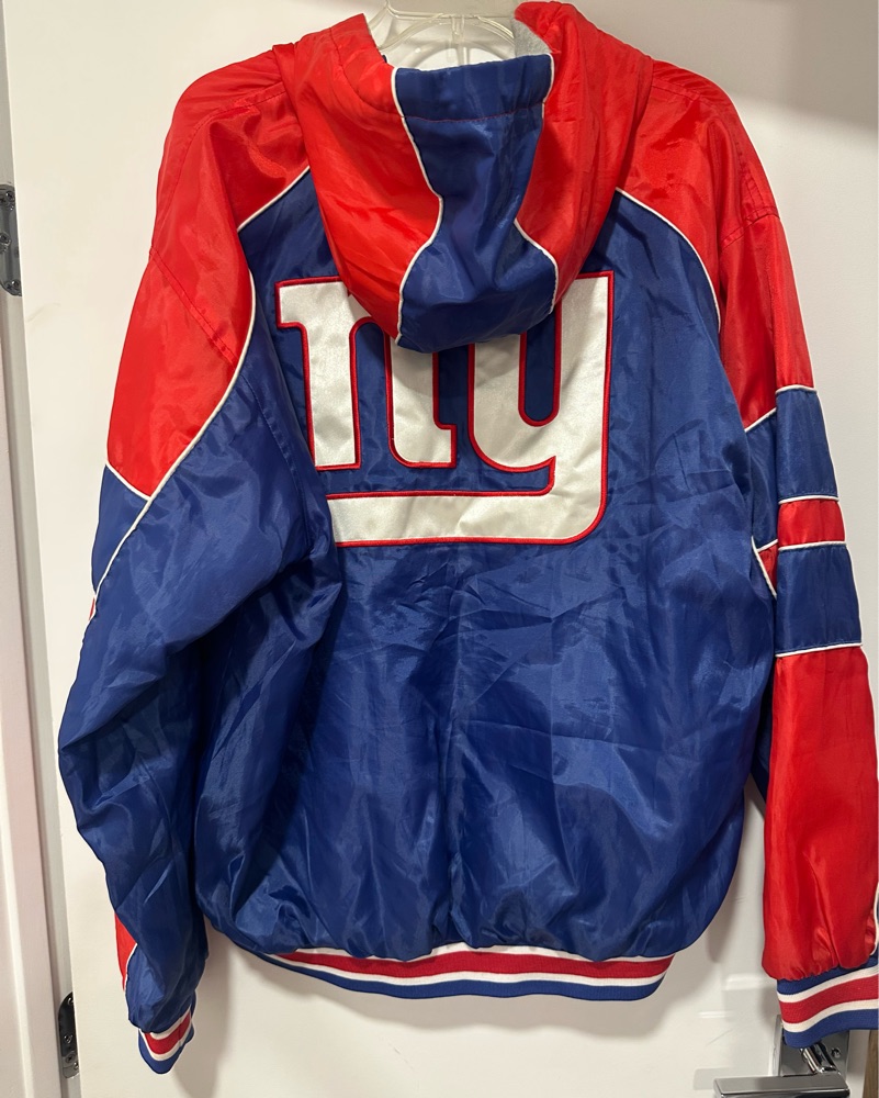 This vintage NY Giants reversible hooded windbreaker is perfect for game day or casual wear. The bold team colors and graphics make it a stylish choice for any sports fan. Unsure of size.