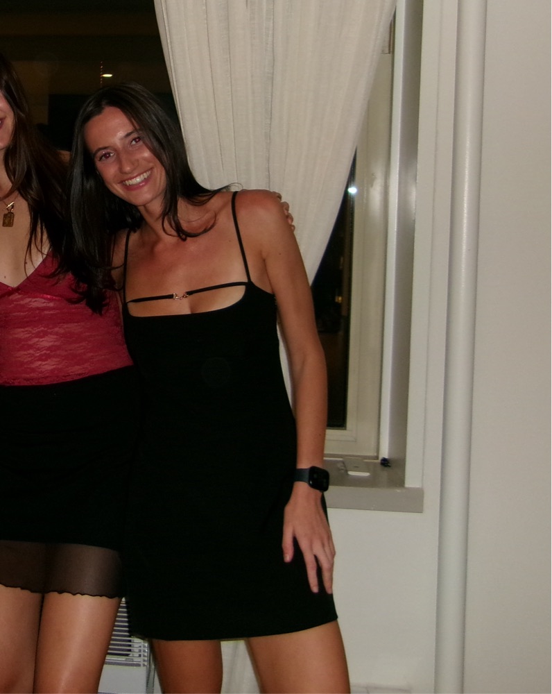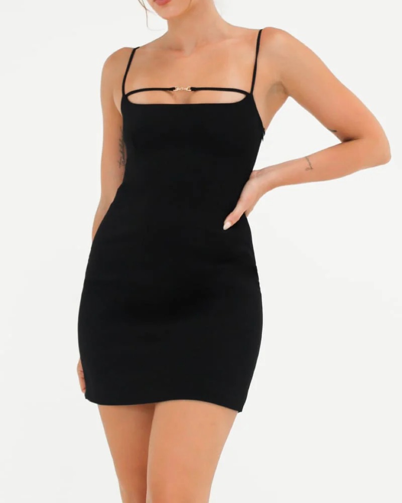 black cocktail dress with gold clasp detail is perfect for a night out or special occasion