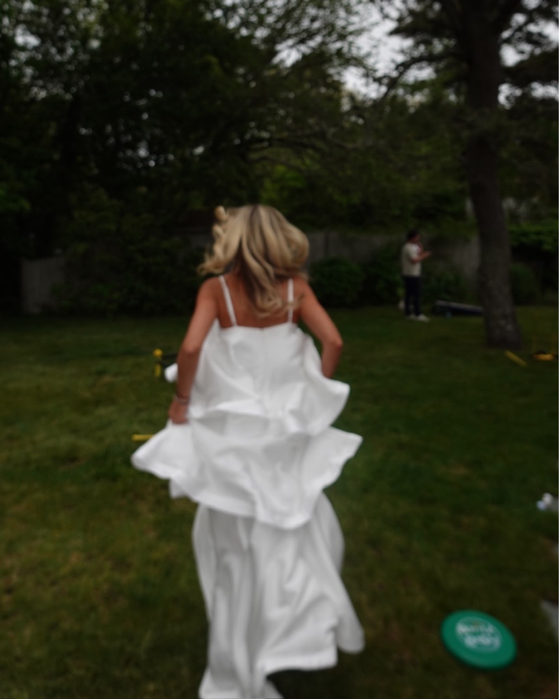 perfect for a formal event or wedding. Size XS but loose and fits like a small. Worn just once! The train is very long and drags on the ground there is SLIGHT discoloration just from natural wear and it dragging on the floor. Please be careful with the white!