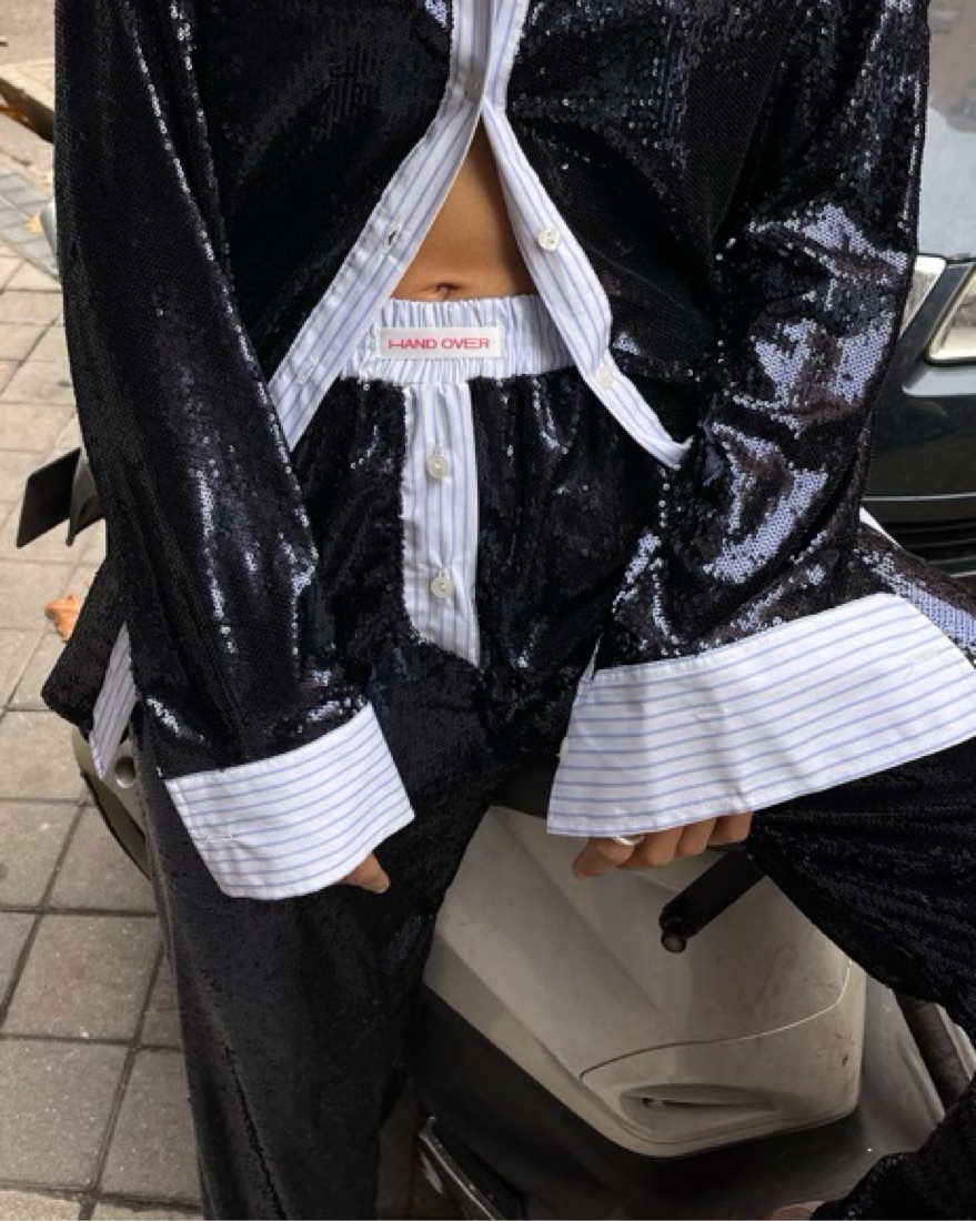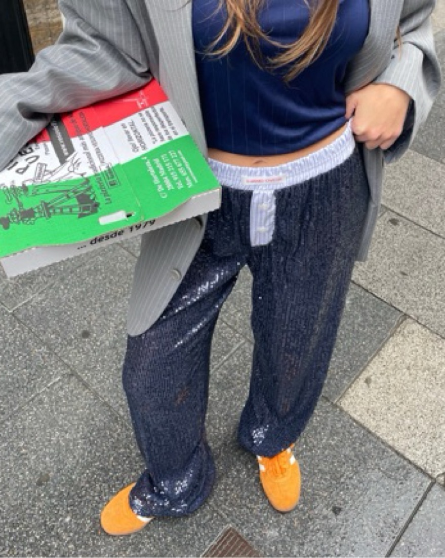 Handover navy blue sequin boxer pants by Handover - Pickle