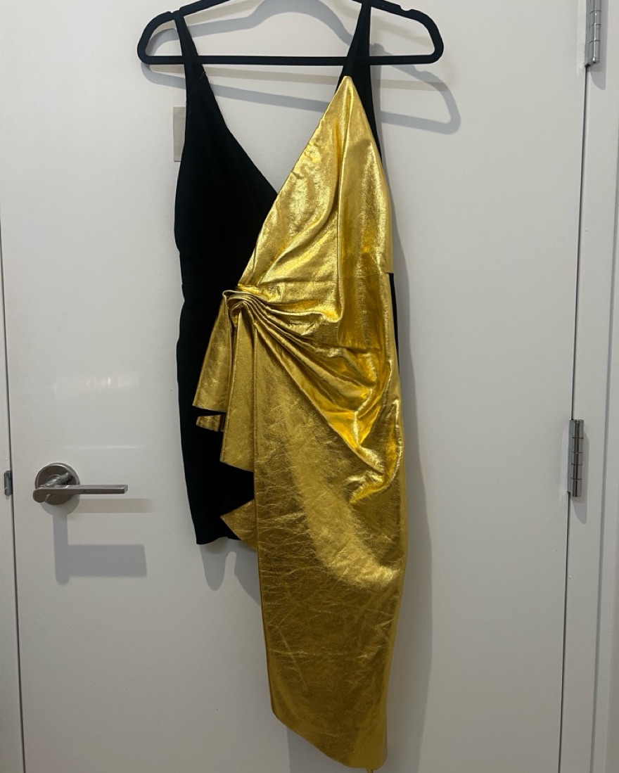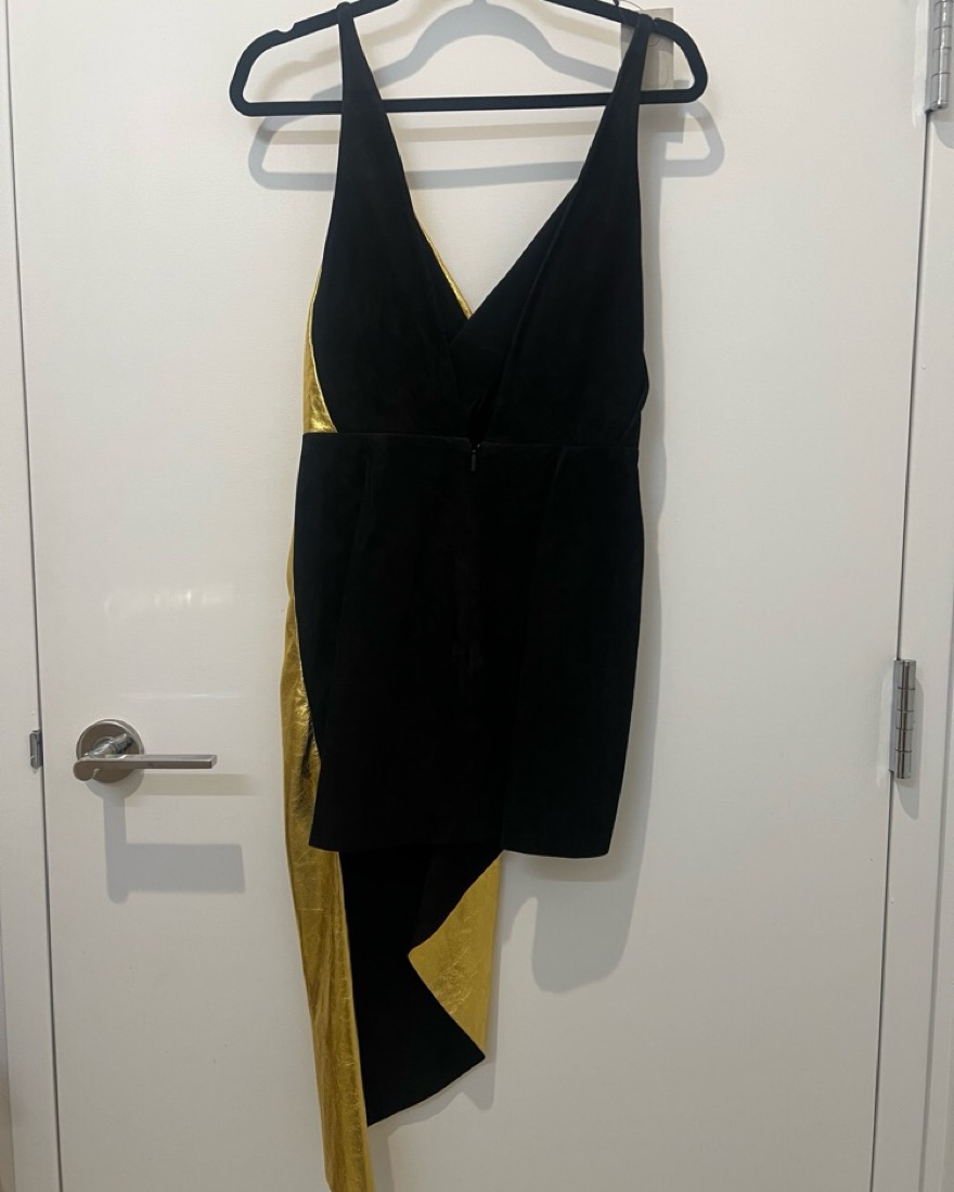 Black suede mini dress with gold metallic overlay. Deep V front and back. Never worn. Sz IT 38