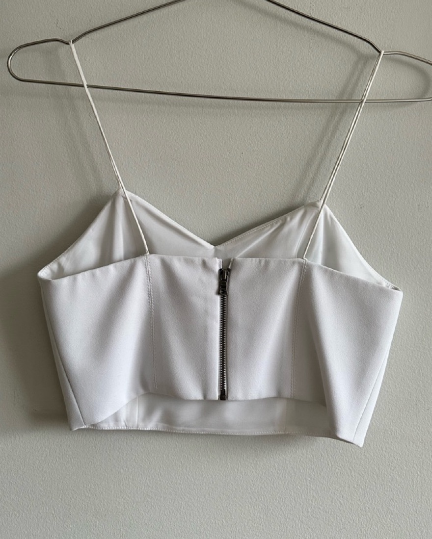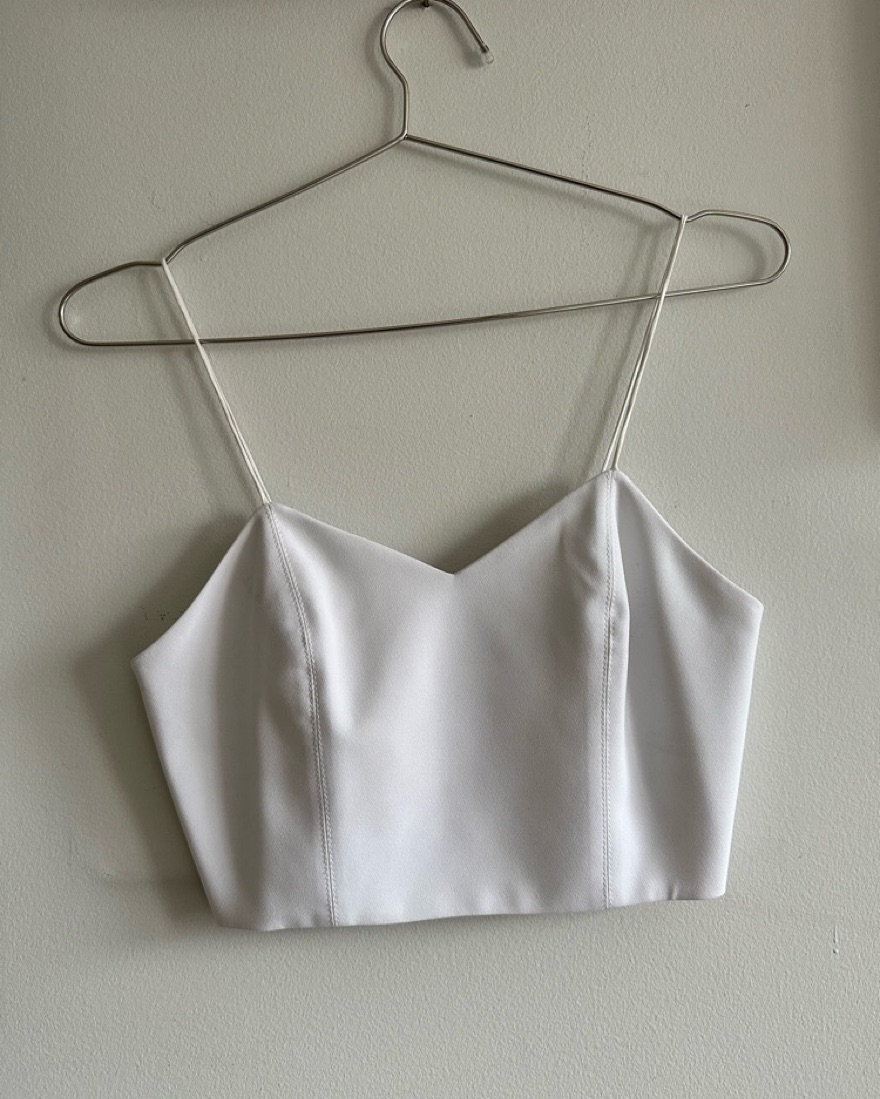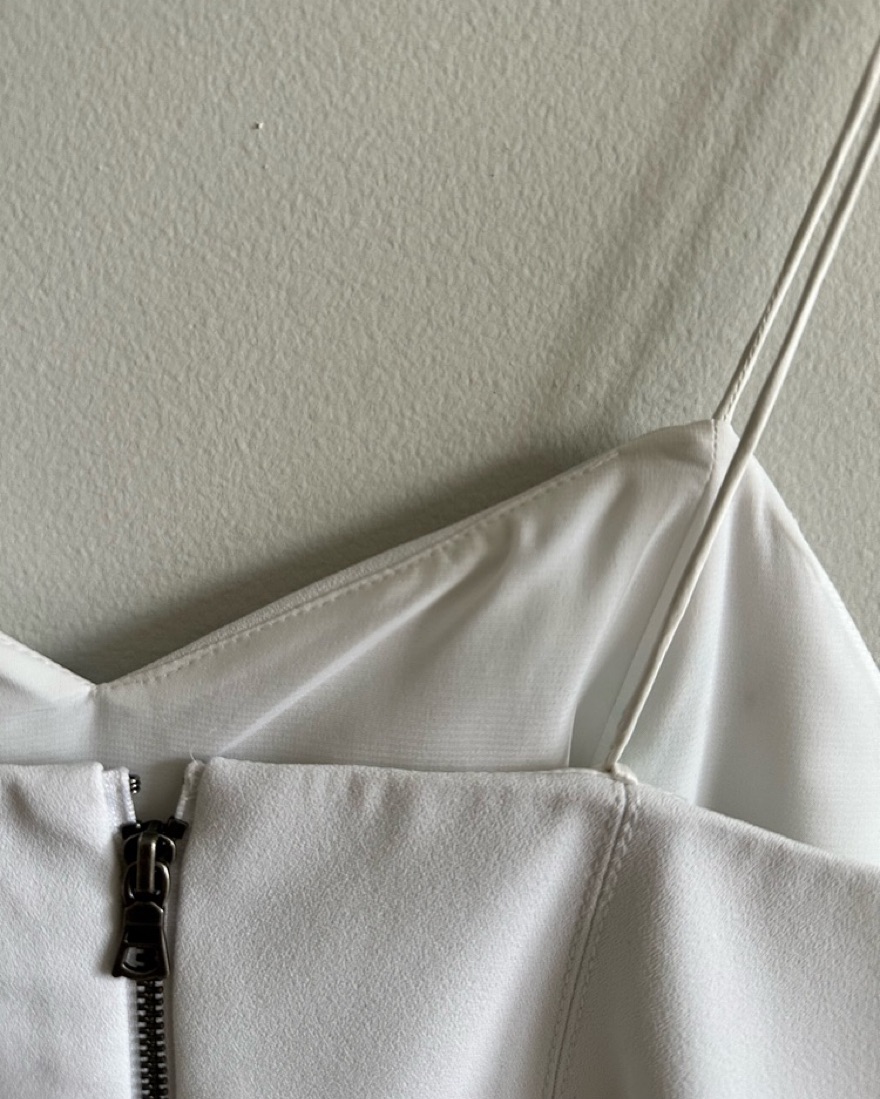 This is a STAPLE! Sweetheart neck and sturdy spaghetti straps, 100% silk lining, very light stains on the inside
