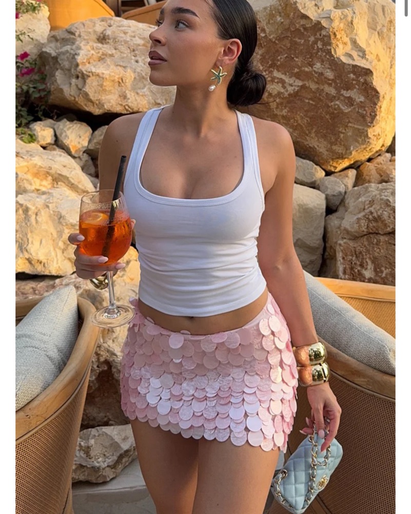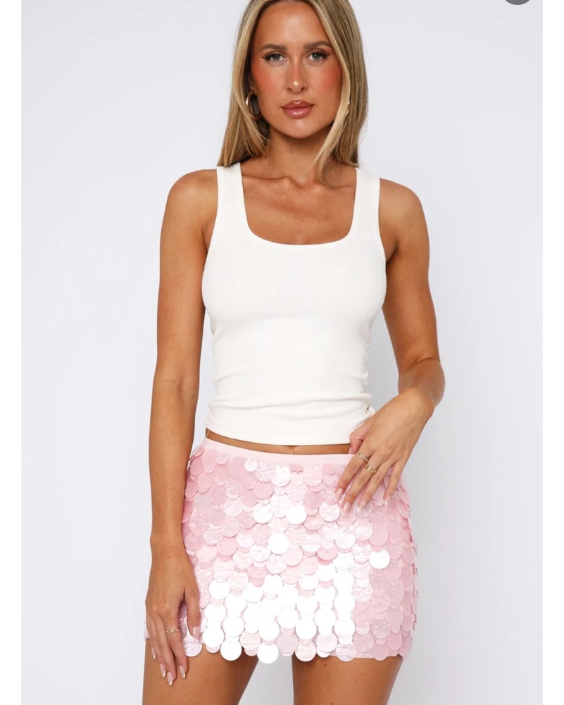 Skirt in SMALL. Please note this is delicate but makes you look like a mermaid lol birthday bachelorette party Vegas any event you want to wow . This skirt runs on the smaller end so best for size xs to s , if you’re between s-m, best to size up. Stretching will cause sequins to fall off.