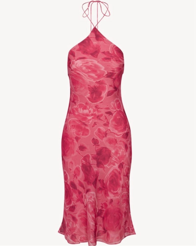 BRAND NEW!!! NEVER WORN. impossible to get! This stunning floral midi dress is perfect for a special occasion or event. The vibrant color and alluring halter neckline create a chic and feminine look that is sure to turn heads.