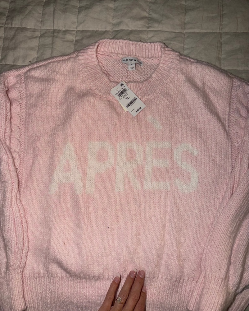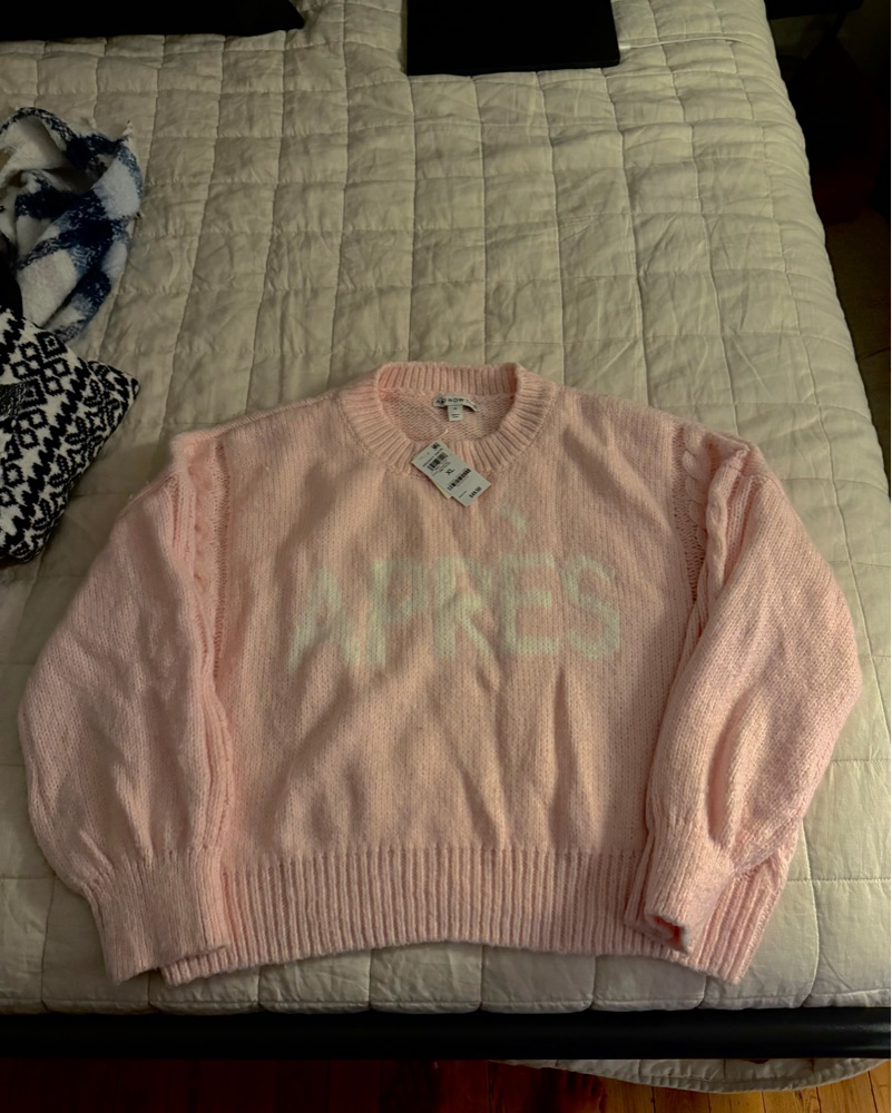apres ski sweater from Macy’s - size XL but fits me perfectly oversized and I’m 5’ 4” 115lb