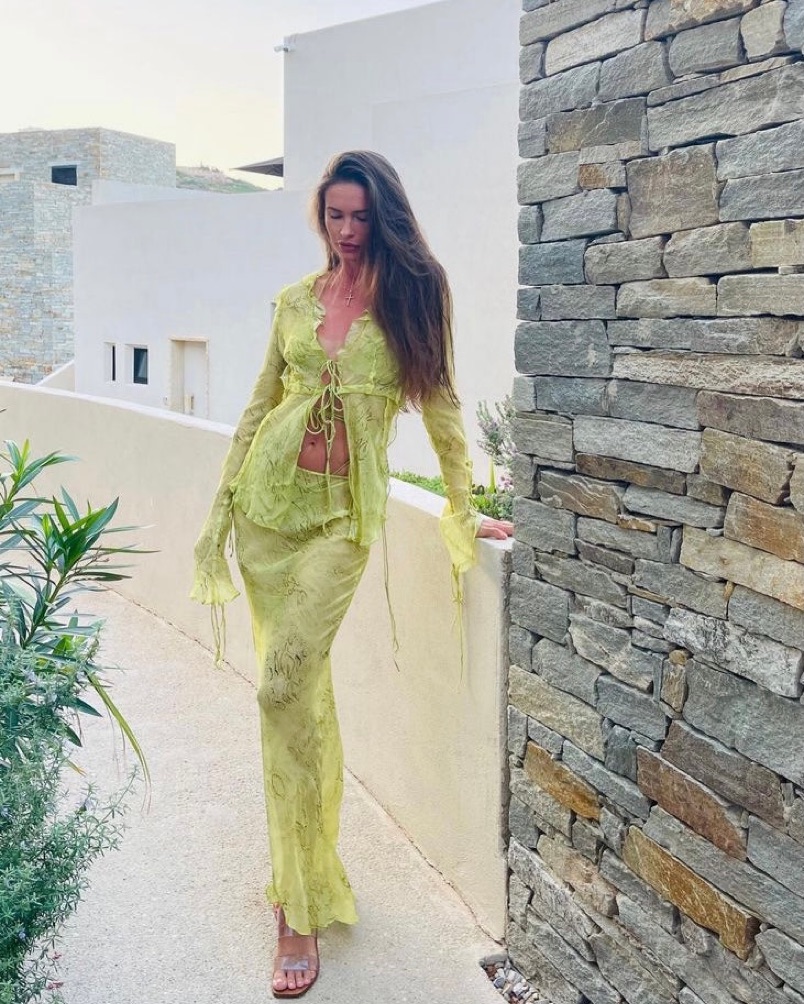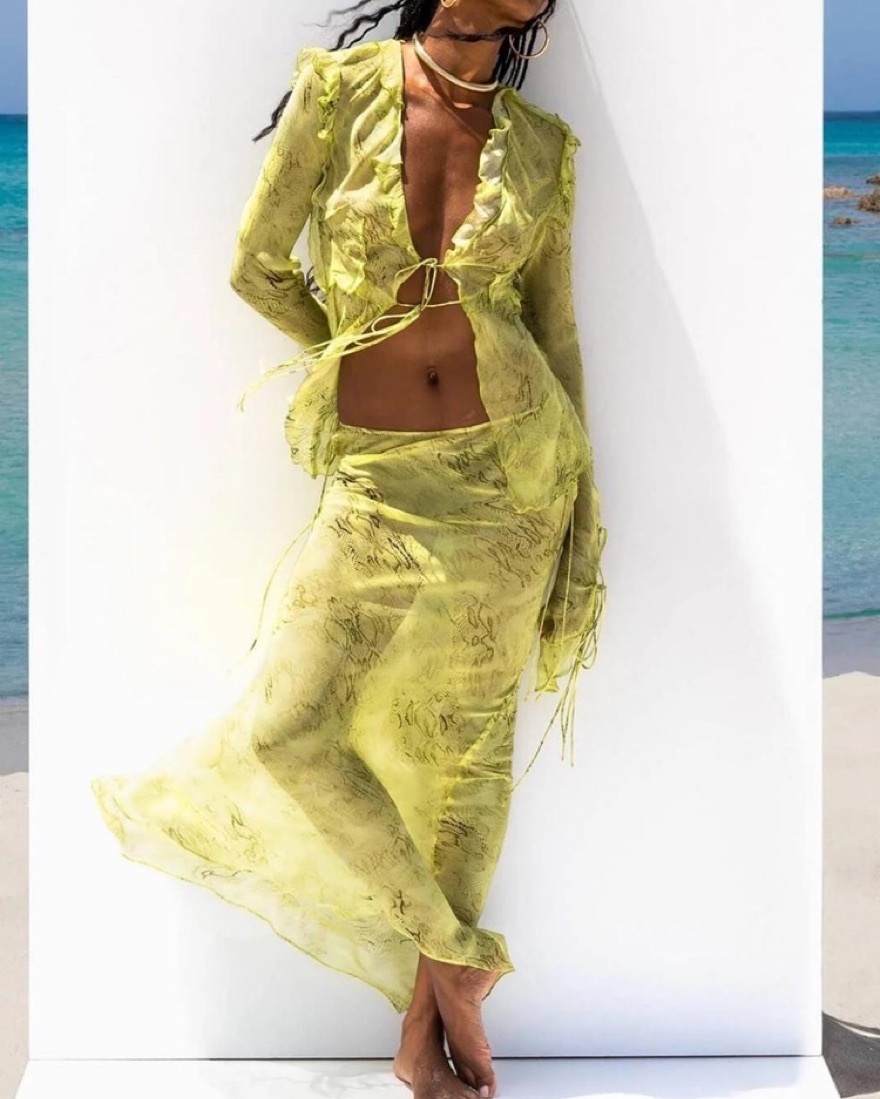 I'm between a size XS/S, 34B, 5'6'', and this set fits me perfectly! The blouse ties in the front and the skirt has ties as well on the sides. The fabric is quite sheer. signs of wear so heavily discounted!