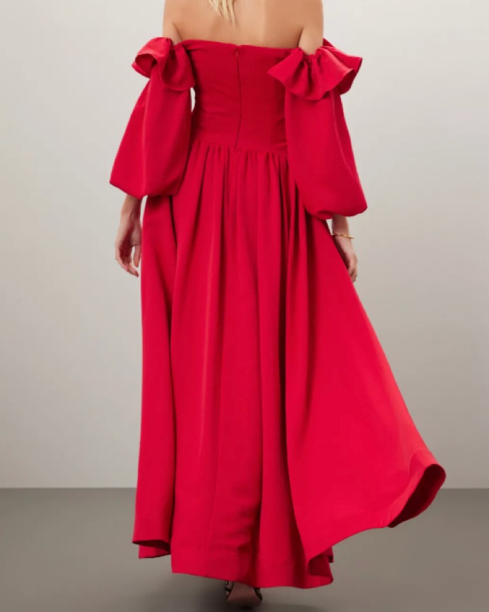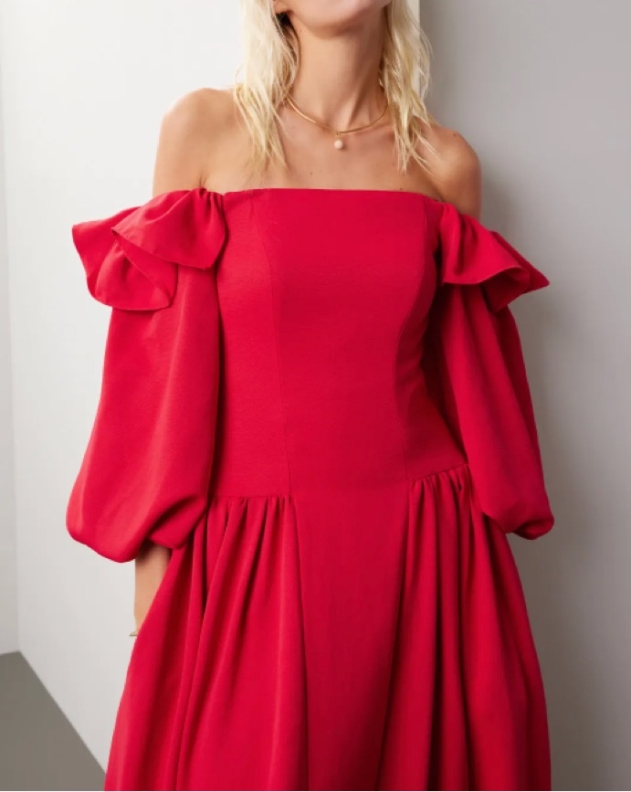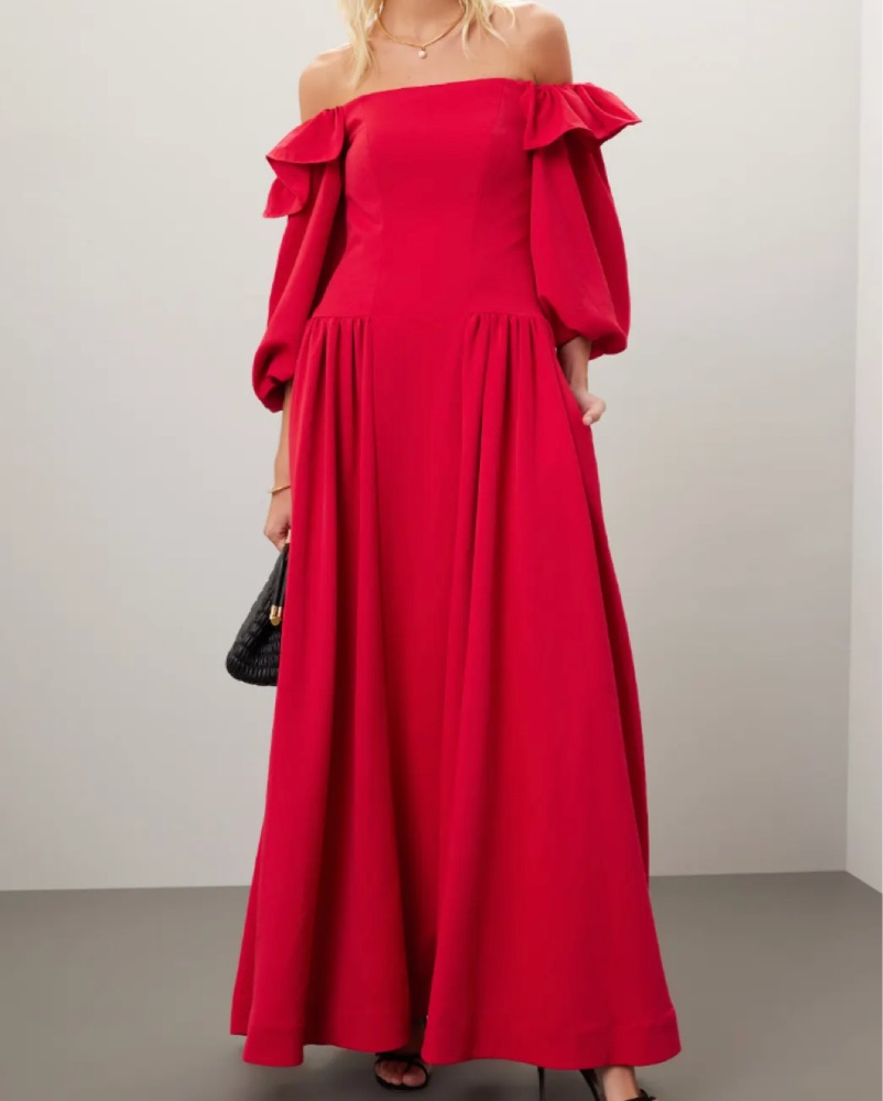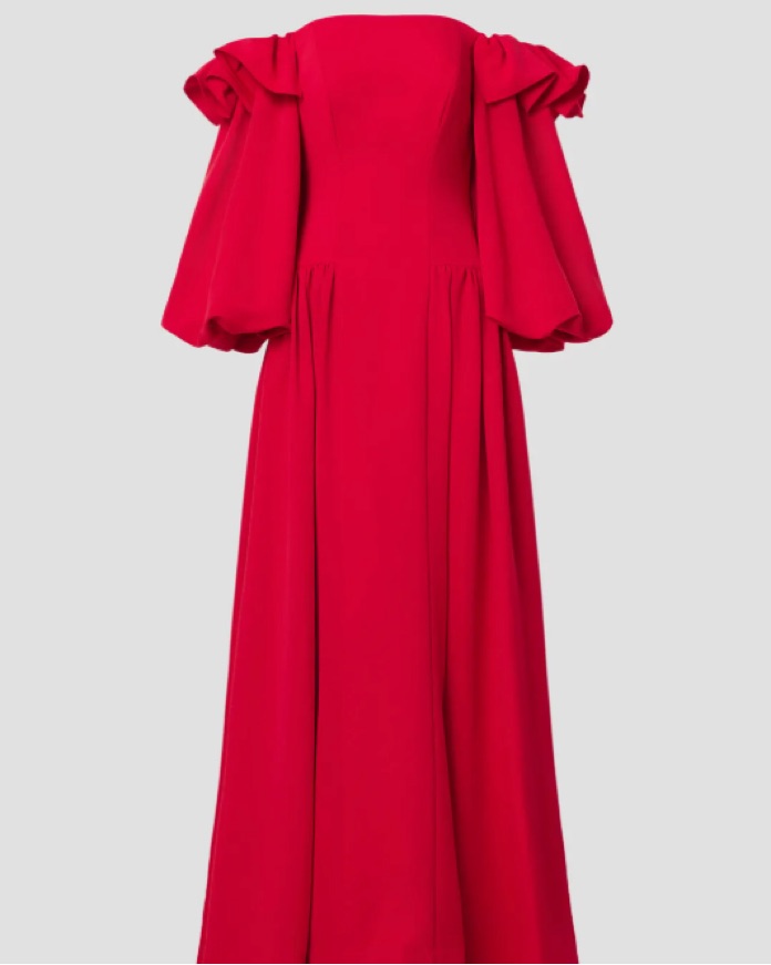 voluminous off-the-shoulder cherry red dress by Zac Posen. Keep accessories delicate and whimsical to let this fabulous gown shine at your next event.