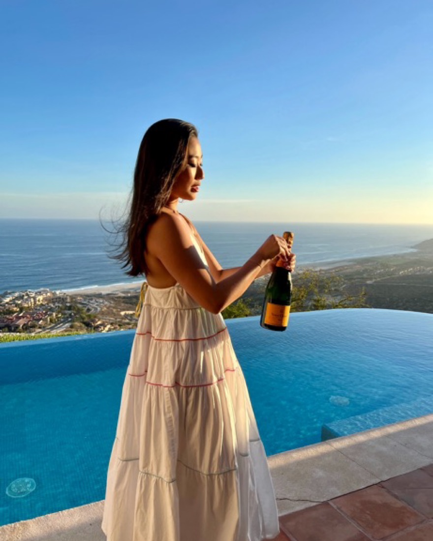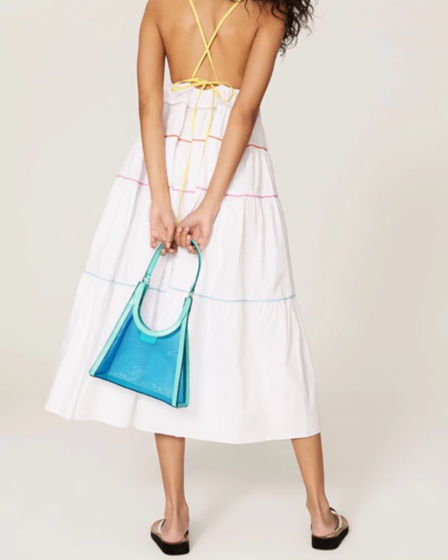 Rainbow trim outlines the flowy tiered silhouette of this day-making dress by Staud. White cotton poplin with multi-color threading (98% Cotton, 2% Spandex). Empire waist dress. Sleeveless. V-neckline. 50" from shoulder to hemline.