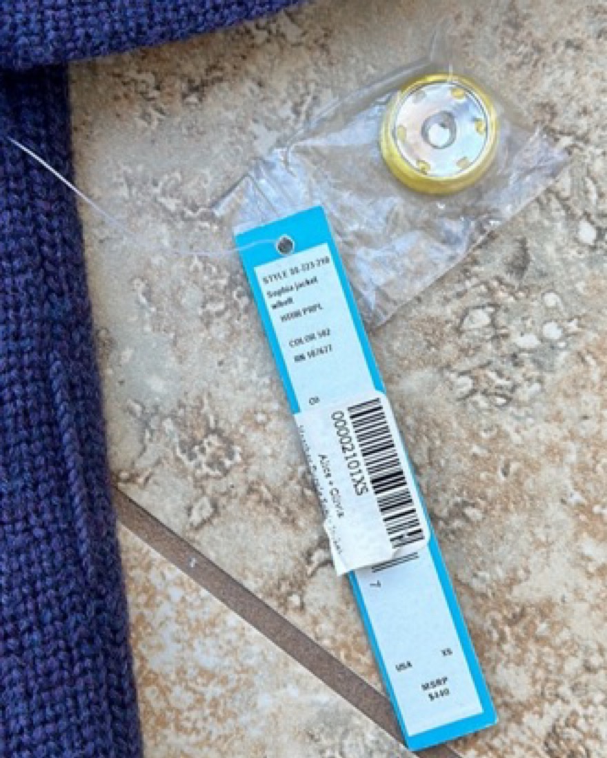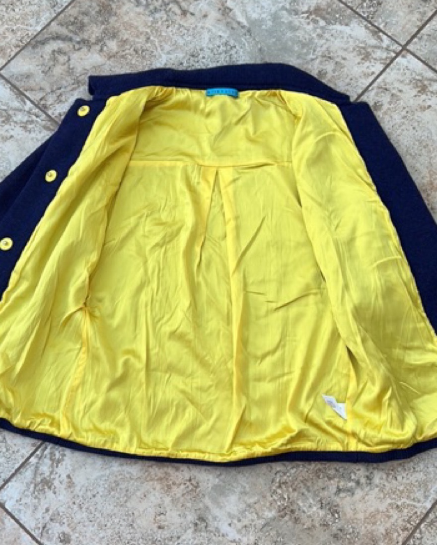 Sophia Sweater Knit jacket, preppy style. Indig, blue-ish purple outside with canart yellow inside