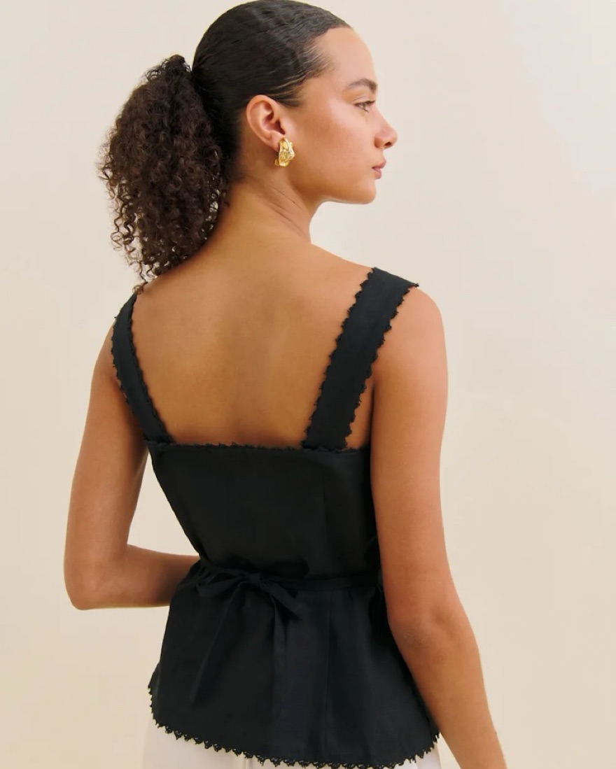 The cutest black linen top, straps are adjustable to be tighter or looser with a button detail and it has a tie in the back to help cinch.
