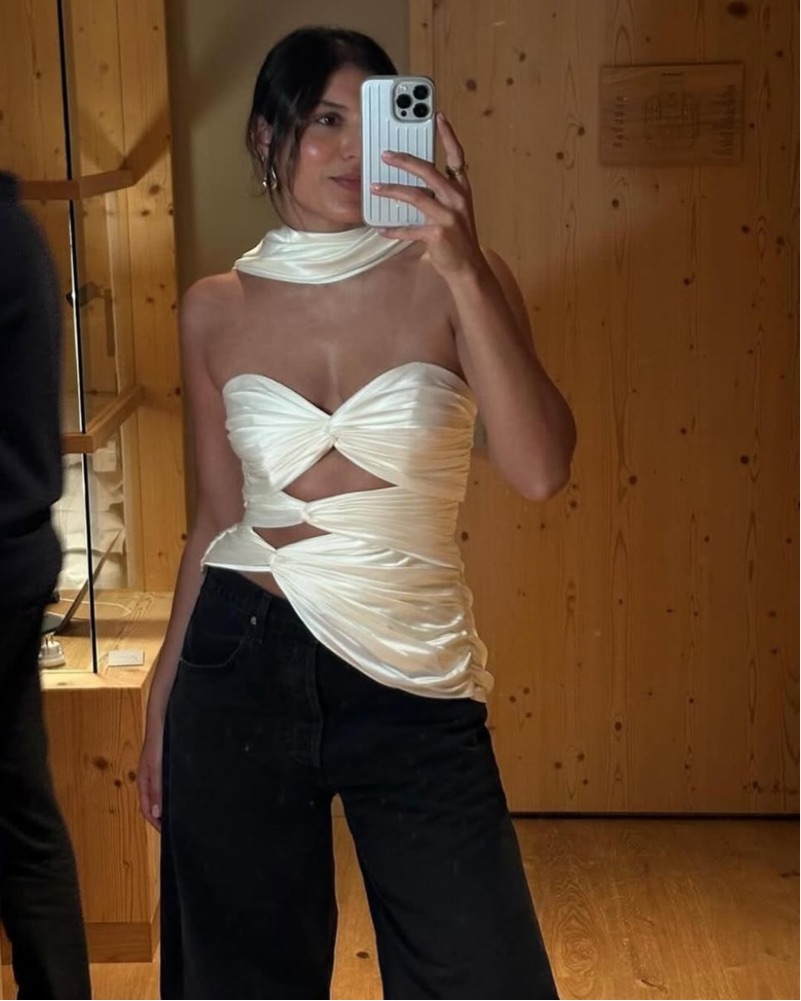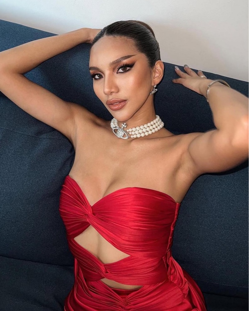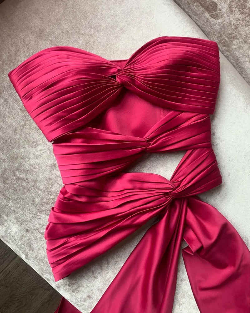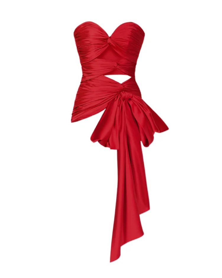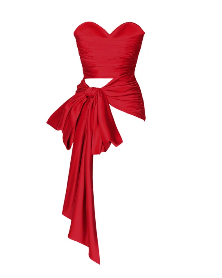 Gorgeous and sculpting, the 3 Carats Bustier by Stolen Studio features hand-pleated silk satin twists and chic tie details at the hips. Color is red . From the @stolen.stores on instagram