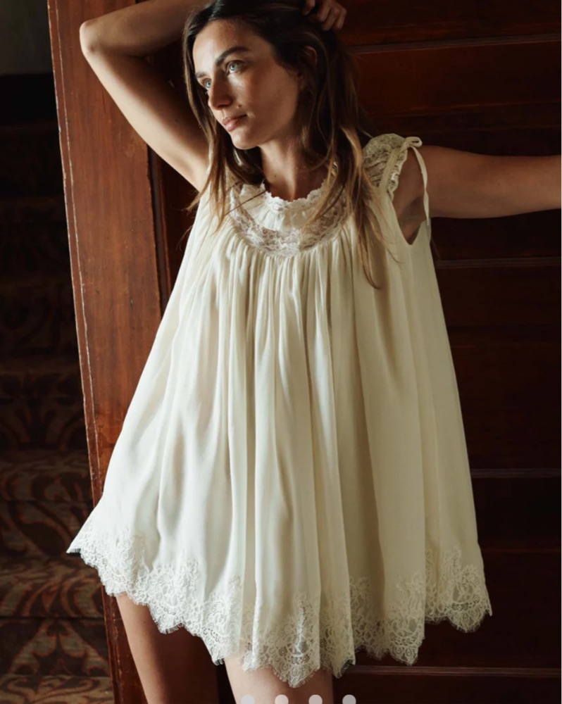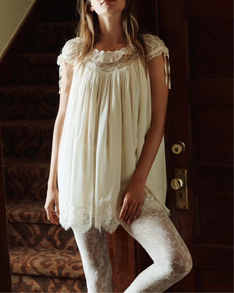 Inspired by babydoll dresses of the 1960s, the Genevieve Dress is crafted from floaty silk georgette and fully lined in silk. The lace yoke and cap sleeves are detailed with grosgrain ribbon and picot-edged ruffles, while an embroidered lace hem adds a romantic finish.