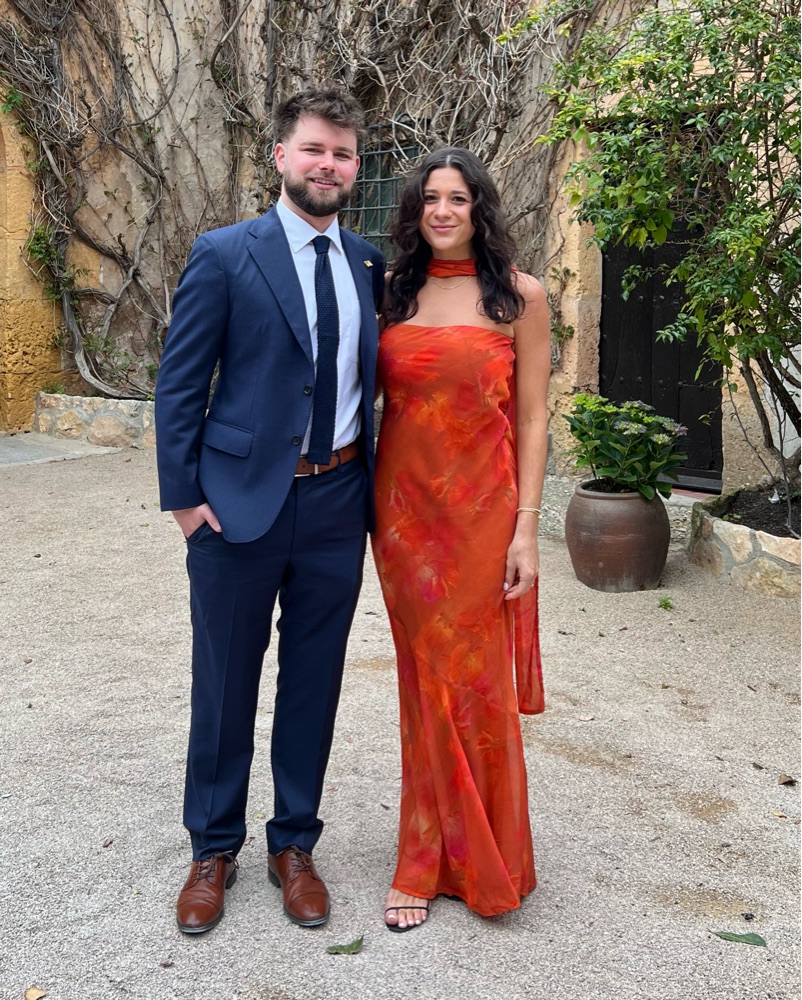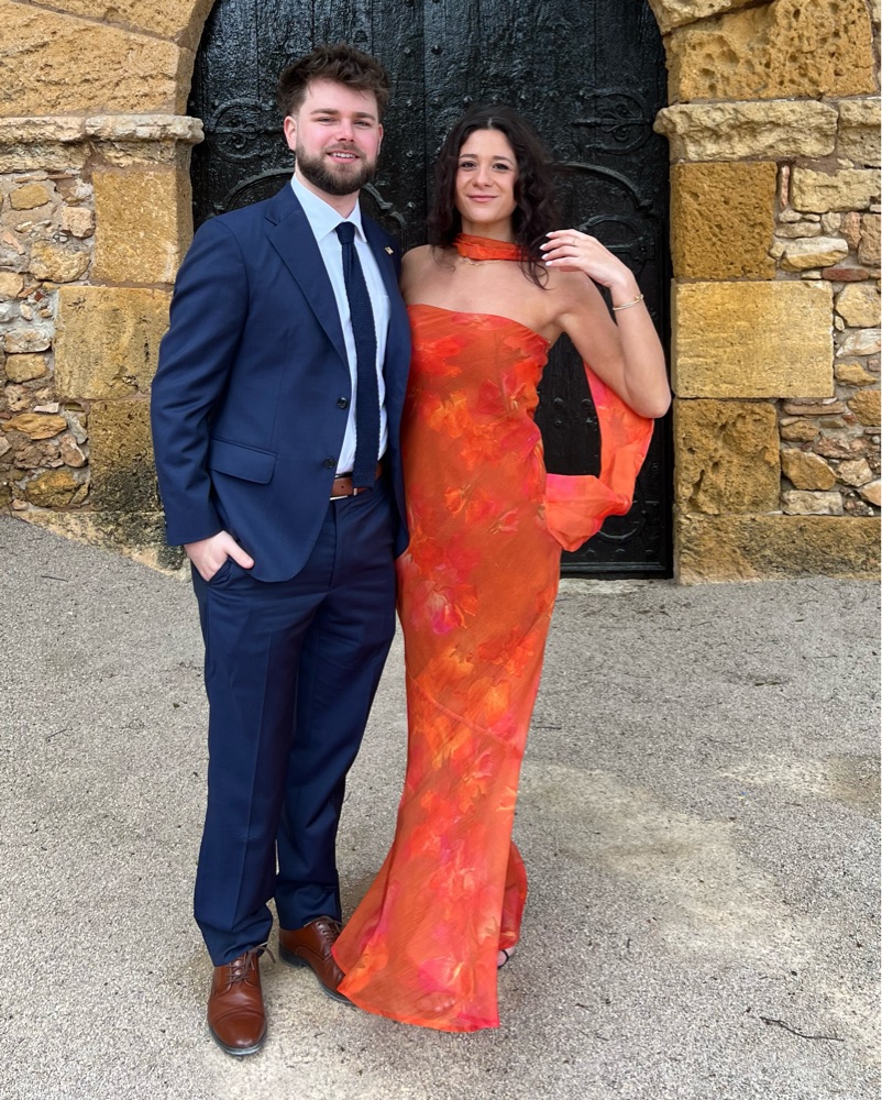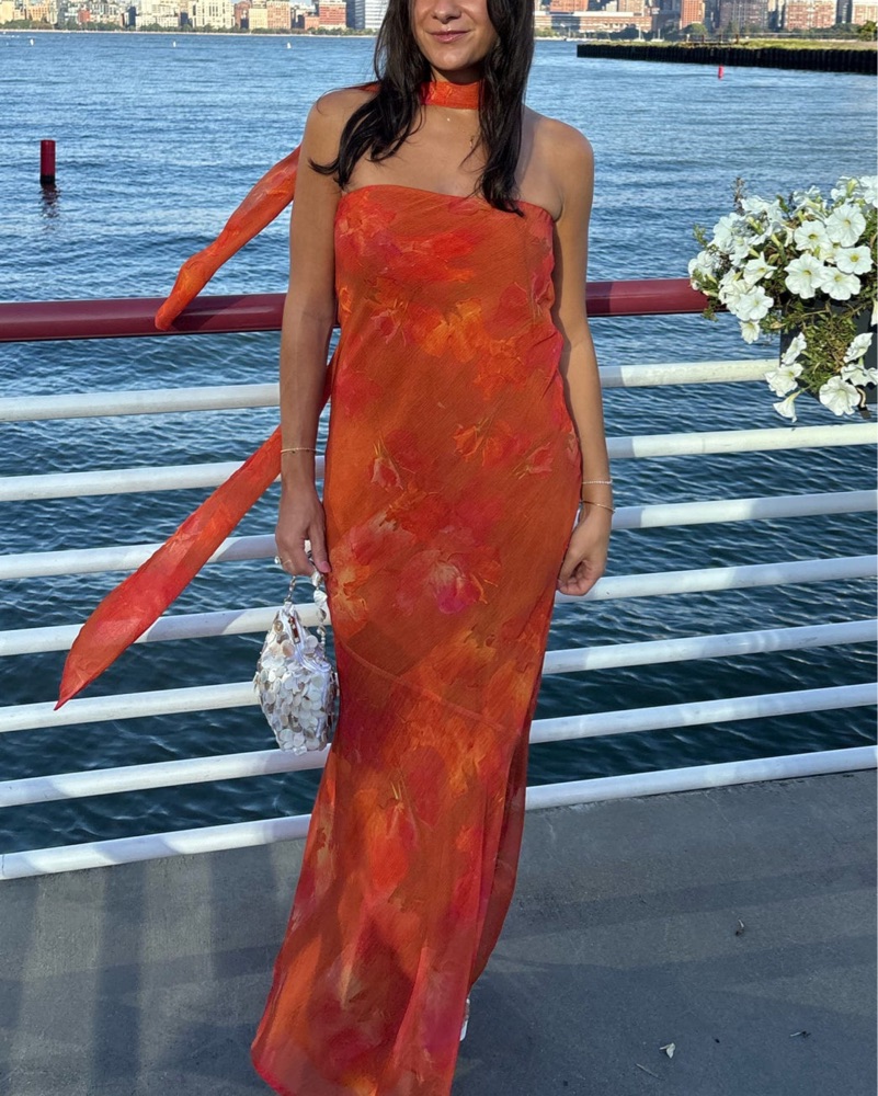 Orange and reddish maxi dress. Comes with neck scarf. Perfect for wedding guest, vacation or event.